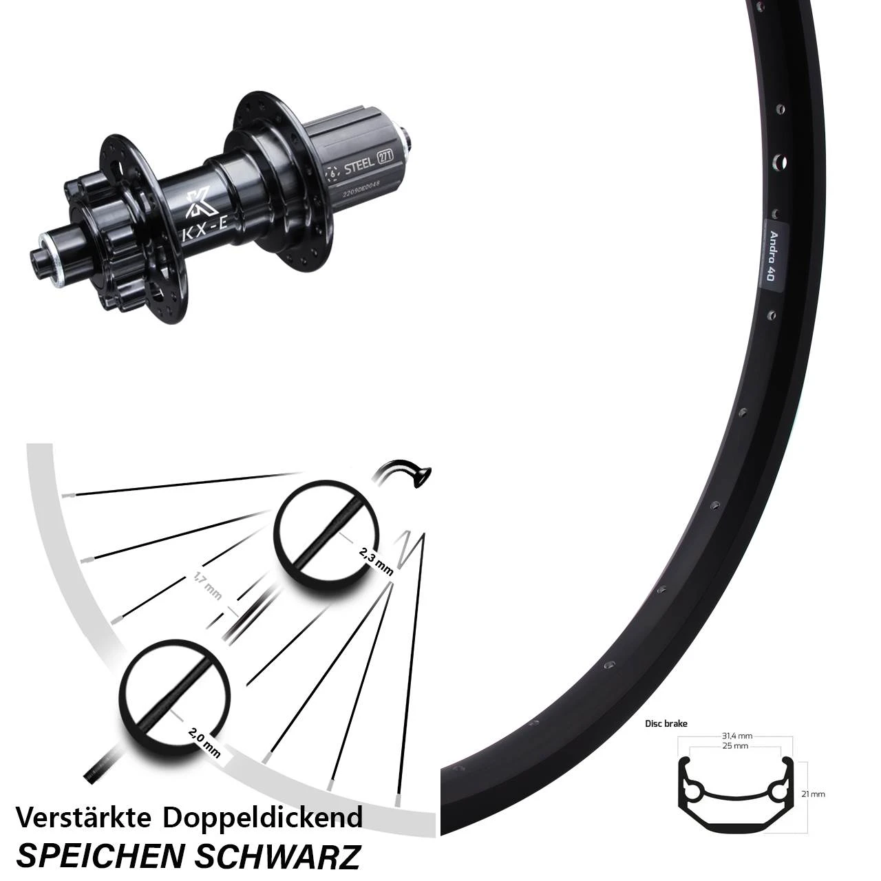 Technische Daten Hinterrad Ryde Andra 40 Disc schwarz und Nabe KX-E Hinterradnabe 6-Loch 5/135 Shimano 11-fach schwarz