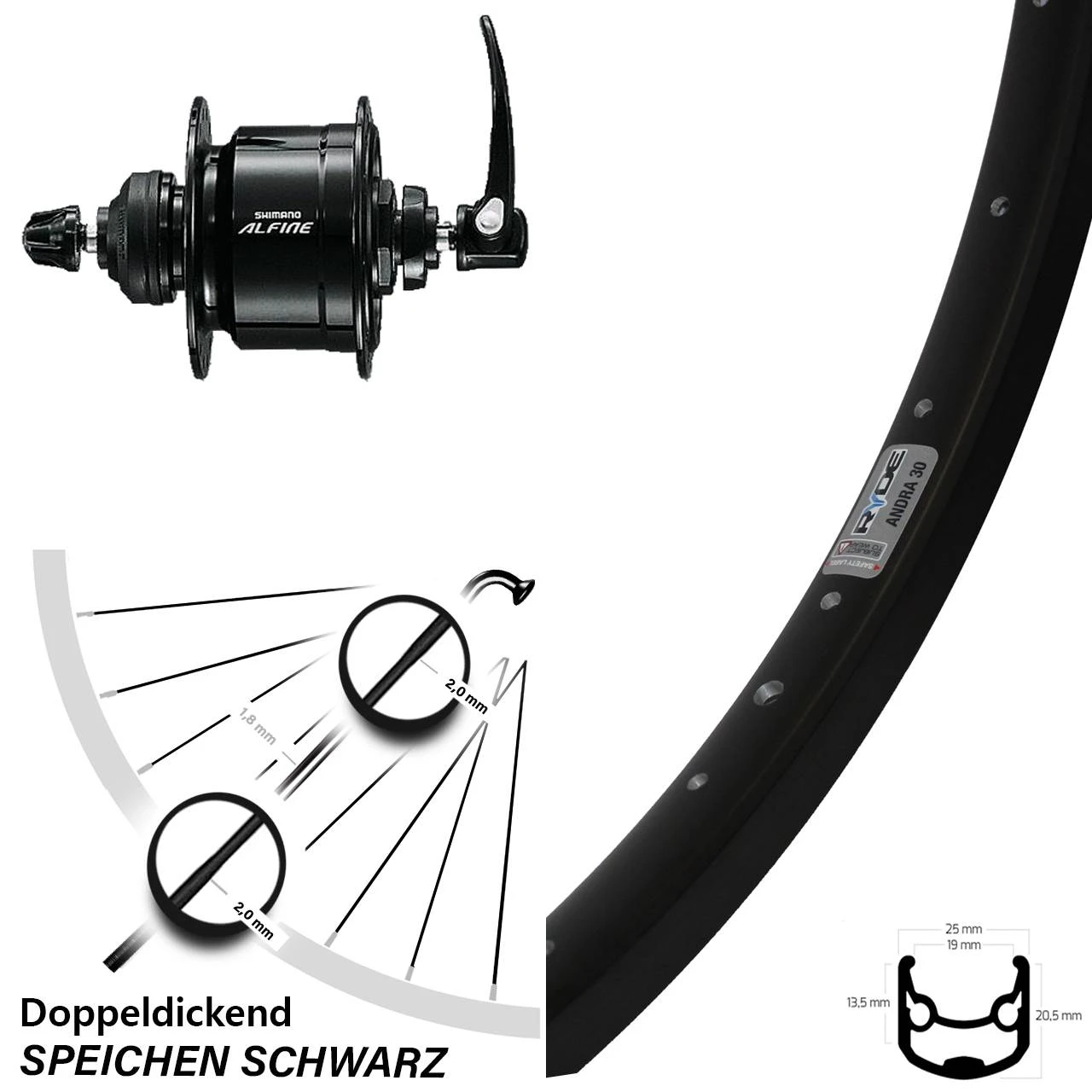 Produktbeschreibung 26 Zoll Ryde Andra 30 Vorderrad schwarz mit Shimano Alfine Nabendynamo