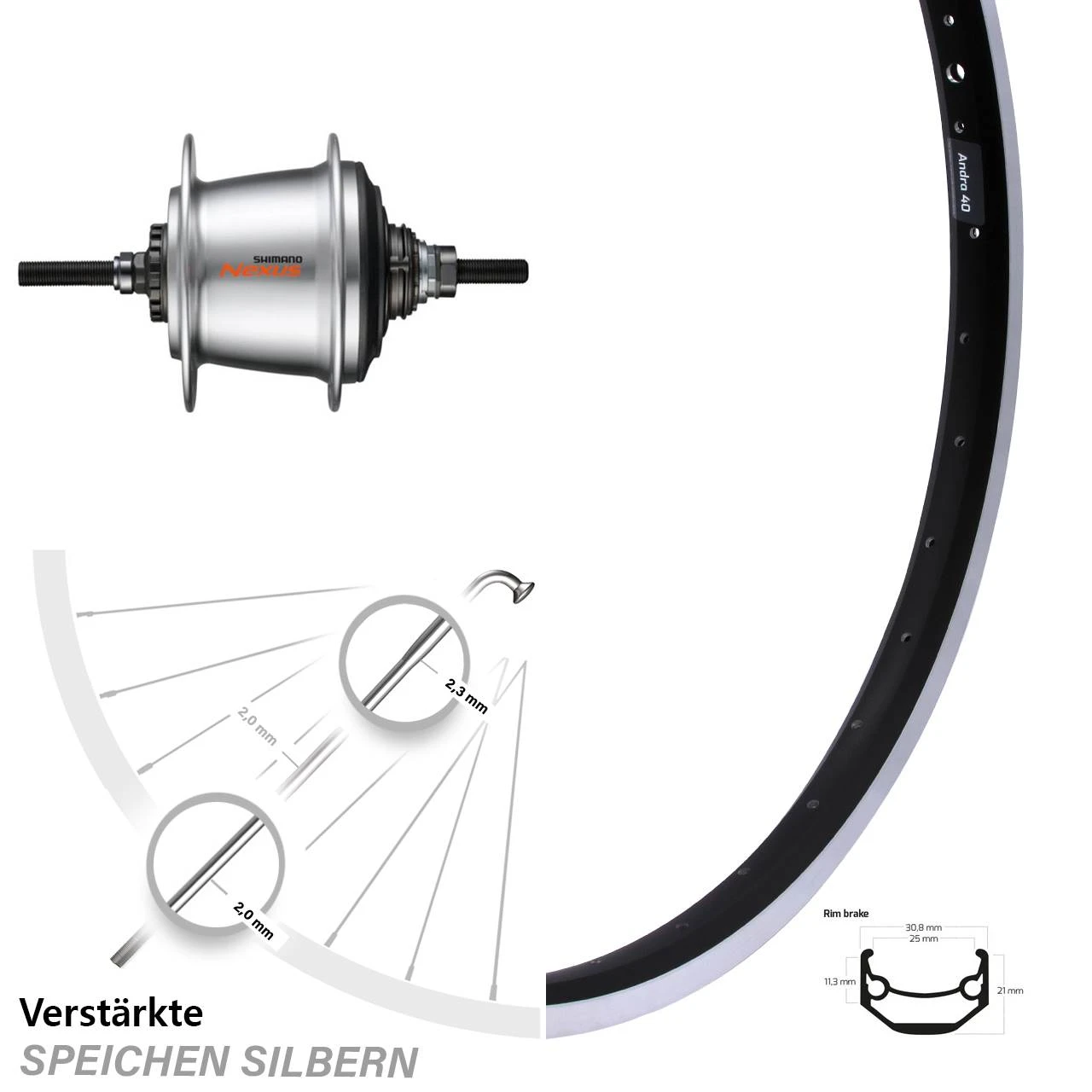 Das 26 Zoll Hinterrad hat eine ETRTO Größe von 25-559 mm, eine Ventillochbohrung von 8,5 mm und ist ausschließlich auf Rollen- und Felgenbremsen ausgelegt. Es hat 130 mm Einbaubreite, eine VOllachse und wird an E-Bike bis 25 km/h, Lastenrädern, City- und Trekkingbikes verbaut. Neben einer schwarzen Ryde Andra 40 Felge ist eine silberne Shimano SGC3001-7R Nabenschaltung verbaut. Das Laufrad wiegt etwa 2469 g und hat bis zu 180 kg zulässiges Systemgewicht.