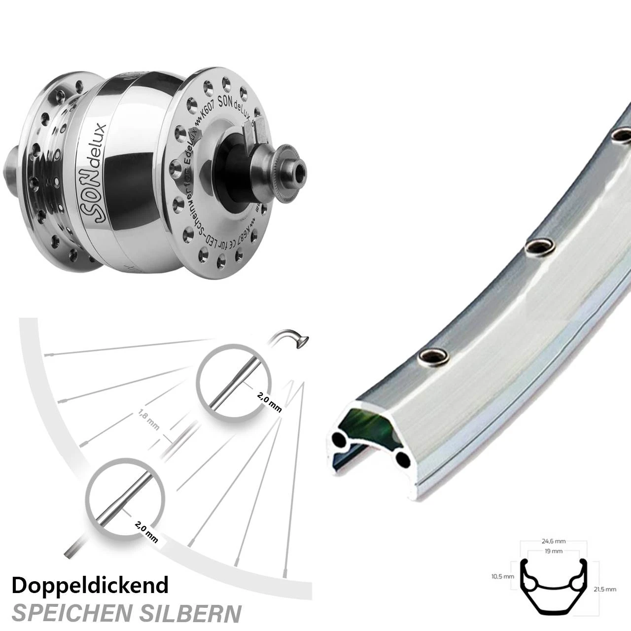 26 Zoll Vorderes Rad mit Nabendynamo Son delux silbern poliert Ryde ZAC 2000 mit Doppeldickendspeichen