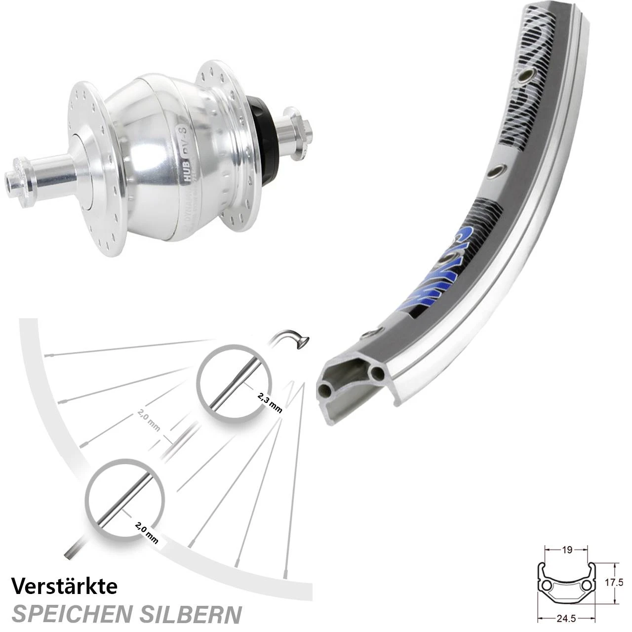 Technische Daten vorderes Laufrad Exal MX 19 silbern & Nabendynamo Shutter Precision PV-8 Felgenbremse silbern