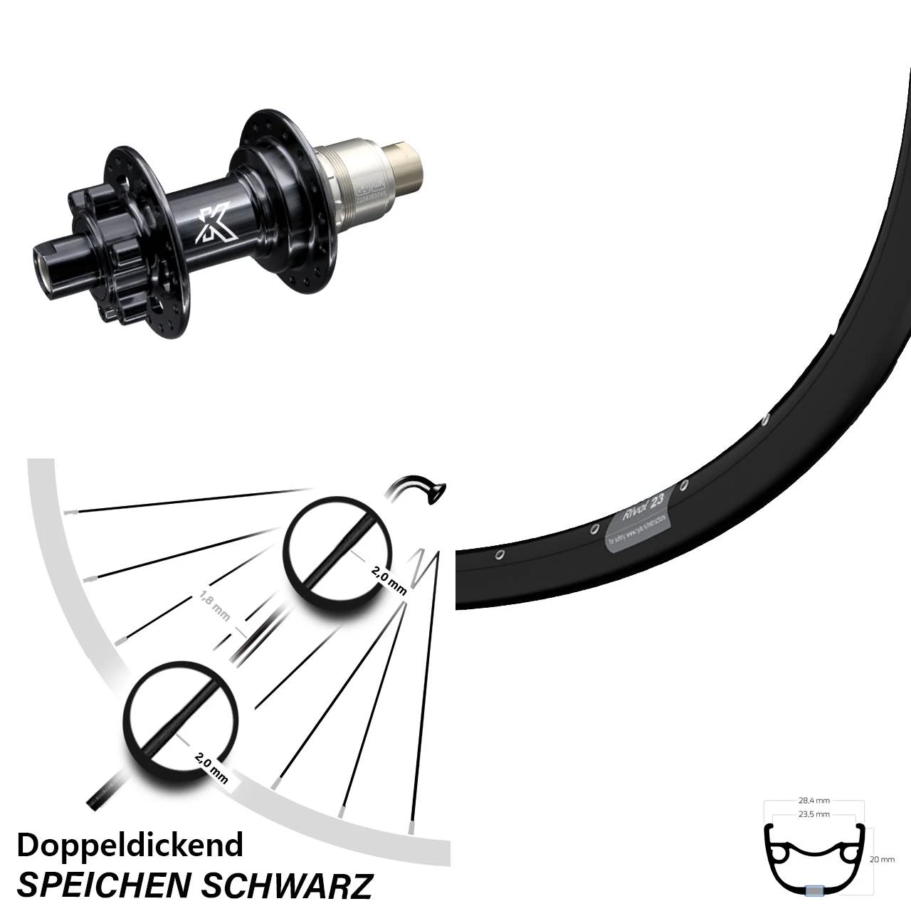 Technische Daten Hinterrad Ryde Rival 23 Disc schwarz und Nabe KX-M Hinterradnabe 12/142 6-Loch SRAM XD