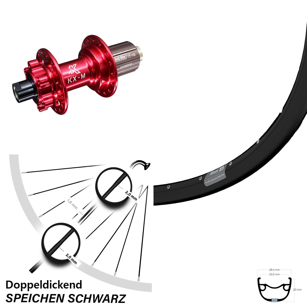 Technische Daten Hinterrad Ryde Rival 23 Disc schwarz und Nabe KX-M Hinterradnabe 12/142 6-Loch 11-fach rot