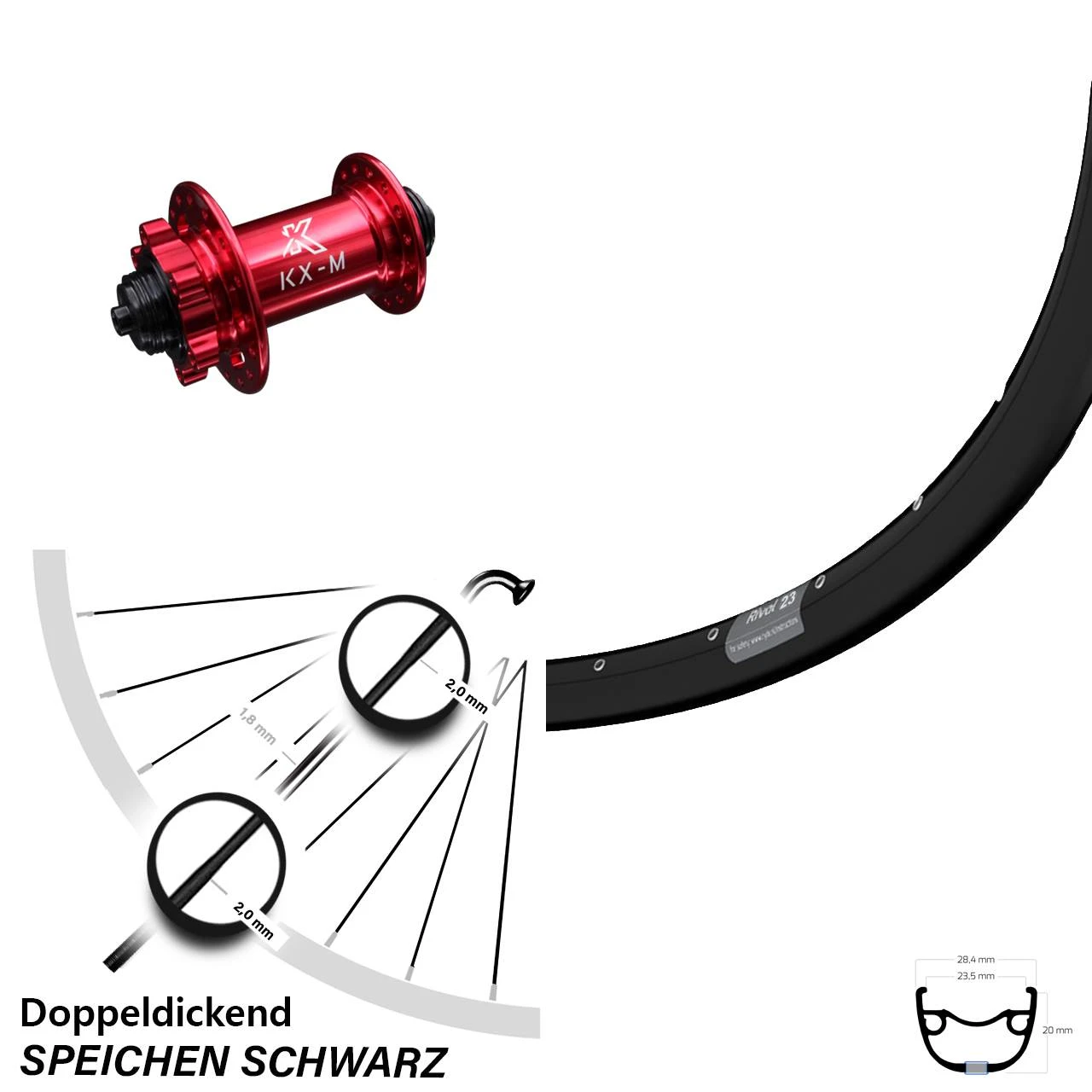 Produktbeschreibung 27,5 Zoll Vorderrad KX-M Nabe rot-eloxiert 5×100 mm Ryde Rival 23 für Schnellspanner