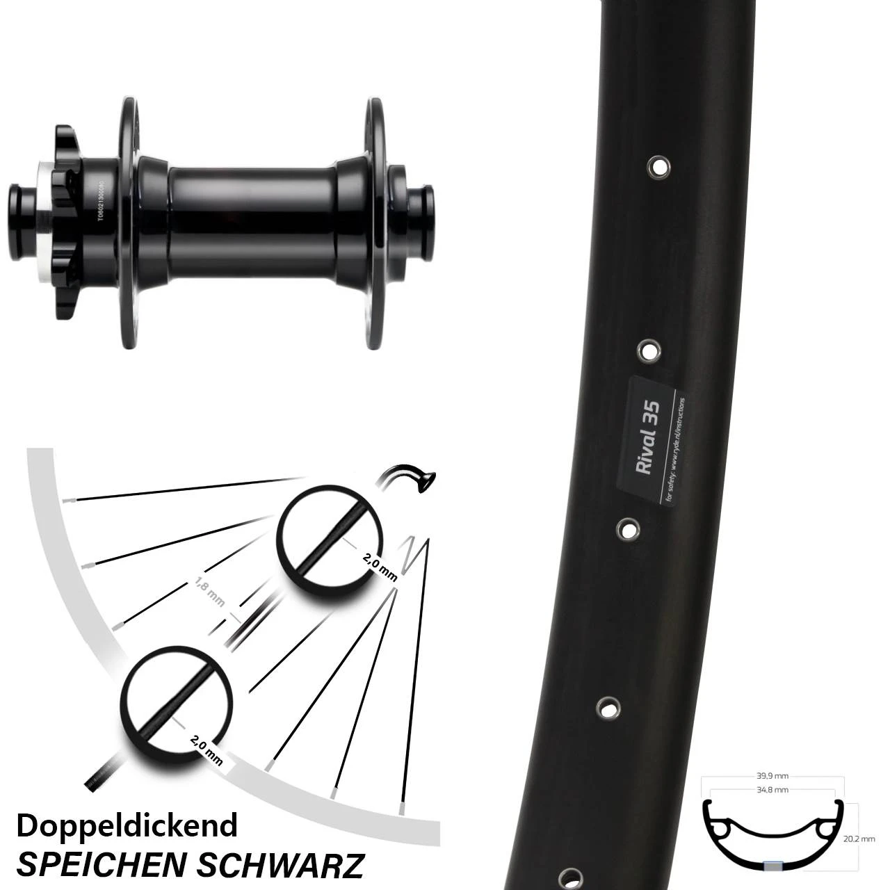 Technische Daten Vorderrad Ryde Rival 35 Disc schwarz mit Nabe Novatec D341-B15 Boost schwarz