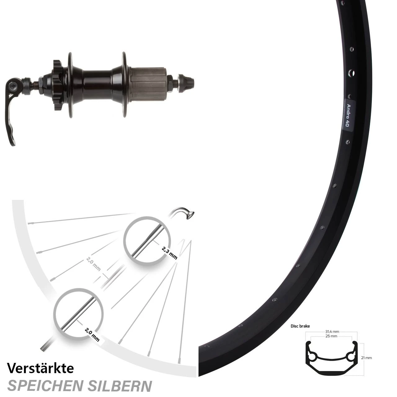 - 32 silberne Sapim Speichen mit Speichenstärke 2,34/2,0 mm Edelstahl verstärkt – besonders stabile und verstärkte Dickendspeiche mit 2,34 mm Durchmesser im kritischen Bereich der Nabe