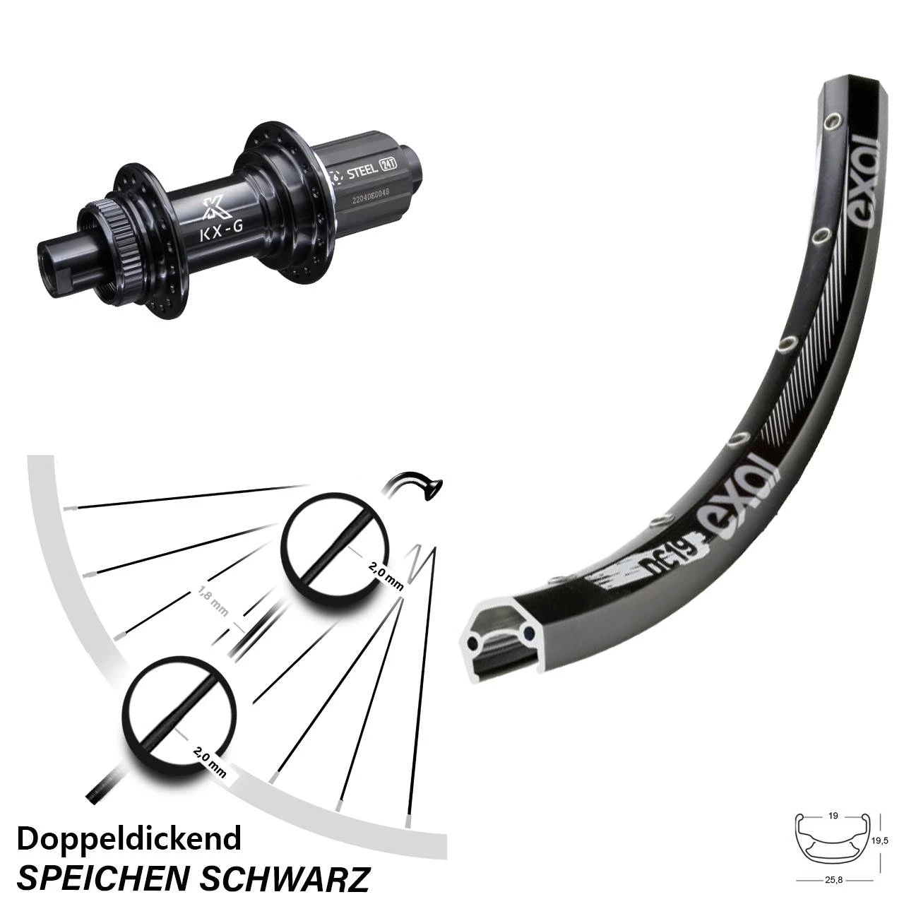 28 Zoll Hinterrad KX-GS schwarz 12×142 mm Centerlock Exal DC 19 mit Doppeldickendspeichen