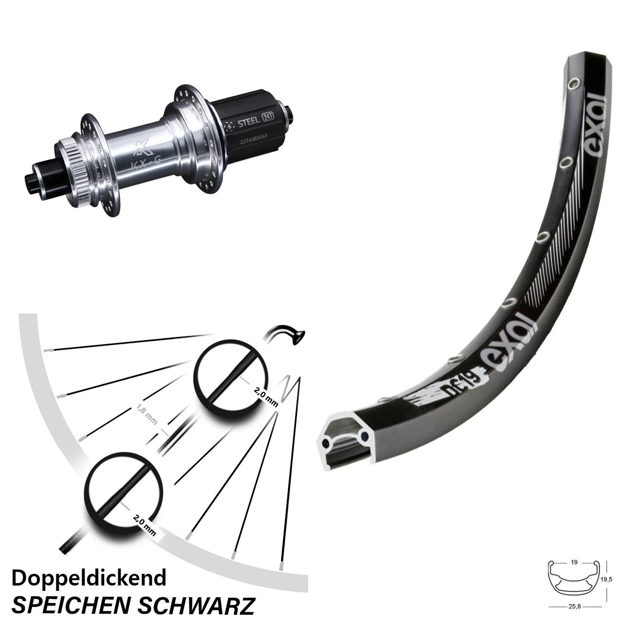 Technische Daten Hinterrad Exal DC 19 schwarz und Nabe KX-G/S Hinterradnabe Centerlock 5/135 silbern