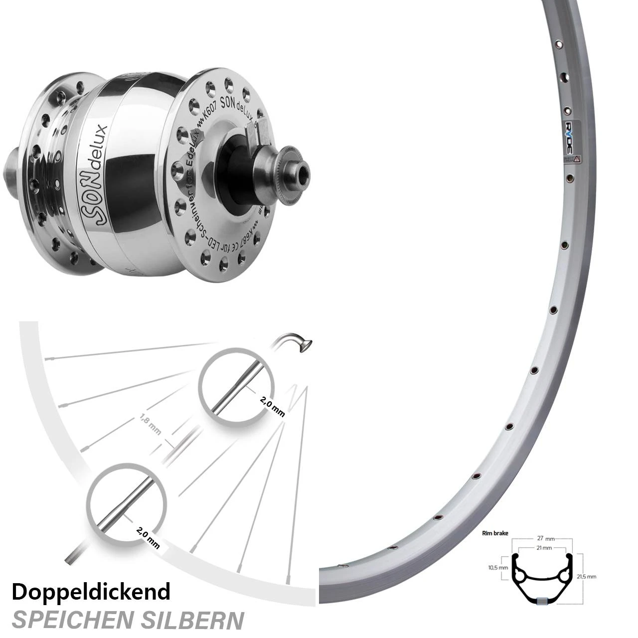 Technische Daten Vorderrad Ryde ZAC 421 Felgenbremse silbern & Nabendynamo SON delux Felgenbremse Hohlachse silbern poliert