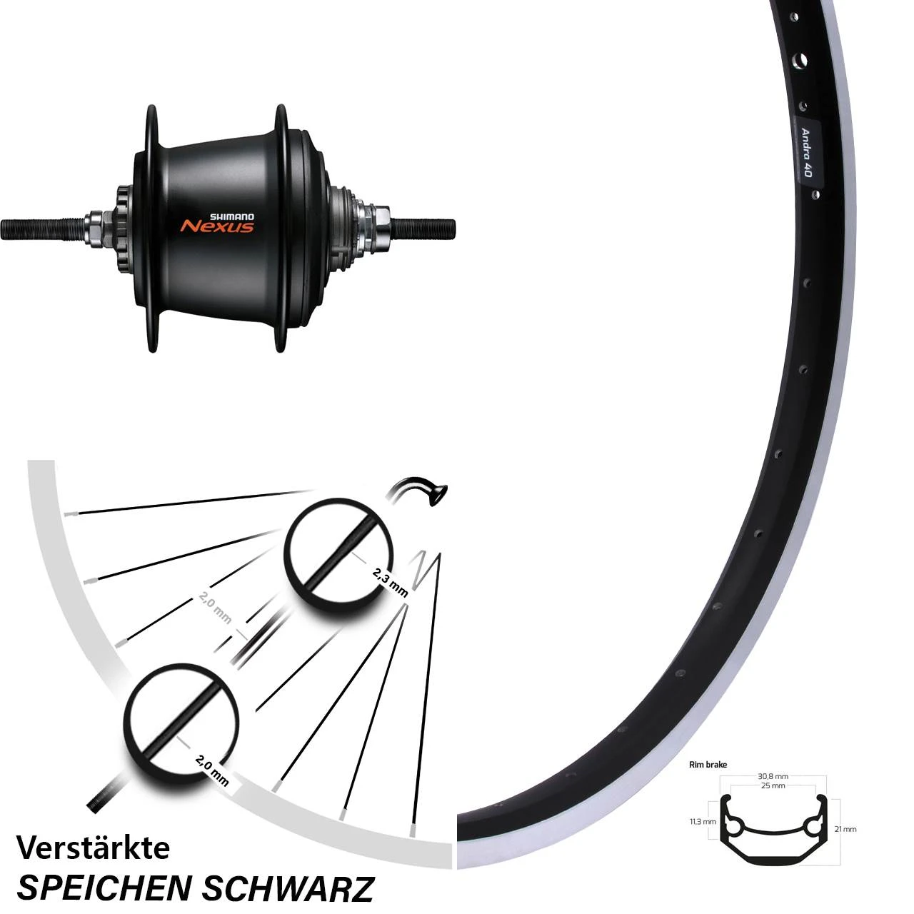 28 Zoll Hinterrad Shimano 7 Gang Freilauf Nabenschaltung Ryde Andra 40 mit verstärkten Speichen