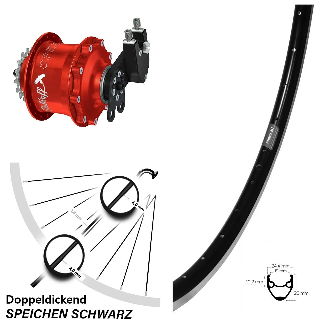 Technische Daten Hinterrad Ryde Andra 20 Felgenbremse schwarz und Nabe Rohloff Speedhub 500/14 CC EX rot