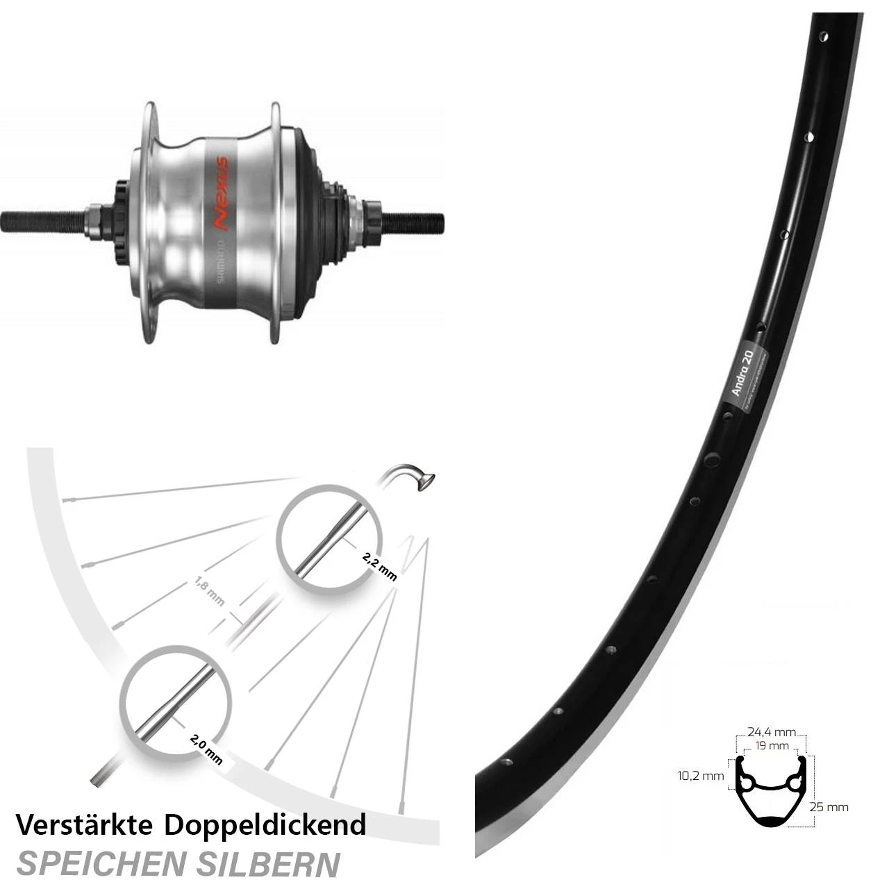 Technische Daten Hinterrad Ryde Andra 20 Felgenbremse schwarz und Nabe Shimano SG-7R50 silbern