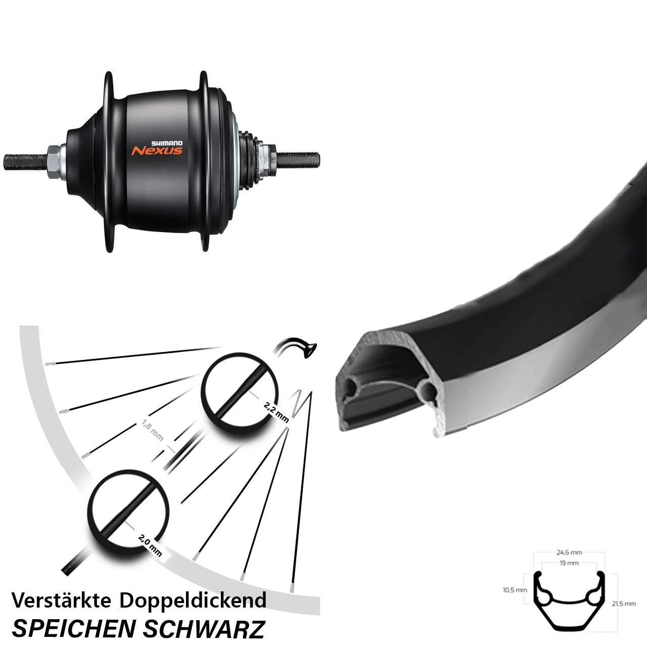 Speichen: Diese Doppeldickendspeiche aus rostfreiem und hochwertigem Edelstahl vom Hersteller Sapim aus Belgien ist eine extra ausgewogene Fahrradspeiche. Sie ist speziell für leichte Laufräder geeignet. Sapim hat hier einen hervorragenden Kompromiss zwischen Gewicht und Stabilität gefunden. Diese leichte Doppeldickendspeiche ist im besonders bruchgefährdeten Bereich der Nabe mit starken 2,2 mm und am Gewindeende mit 2,0 mm besonders stark ausgeführt. Im Mittelteil weist sie „schlanke“ 1,8 mm auf, was Gewicht spart. Zudem fängt die Speiche dank ihrer guten Elastizität und der sehr hohen Festigkeit am Mittelteil mit 1400 N/mm2 auch hohe Zug- und Druckkräfte hervorragend ab. Die endverstärkte Edelstahl- Fahrradspeiche mit 2,2 mm, 1,8 mm und 2,0 mm im Durchmesser kommt beim Trekkingbike, Citybike, E-Bike und Pedelec zum Einsatz.