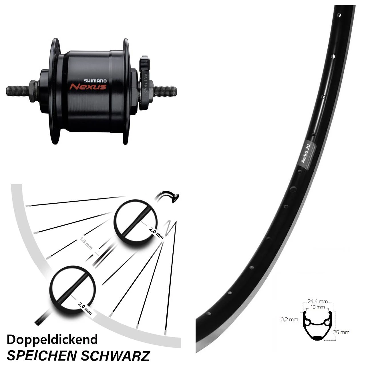 Technische Daten vorderes Laufrad Ryde Andra 20 Felgenbremse schwarz & Nabendynamo Shimano DH-C3000-3N schwarz Festachse