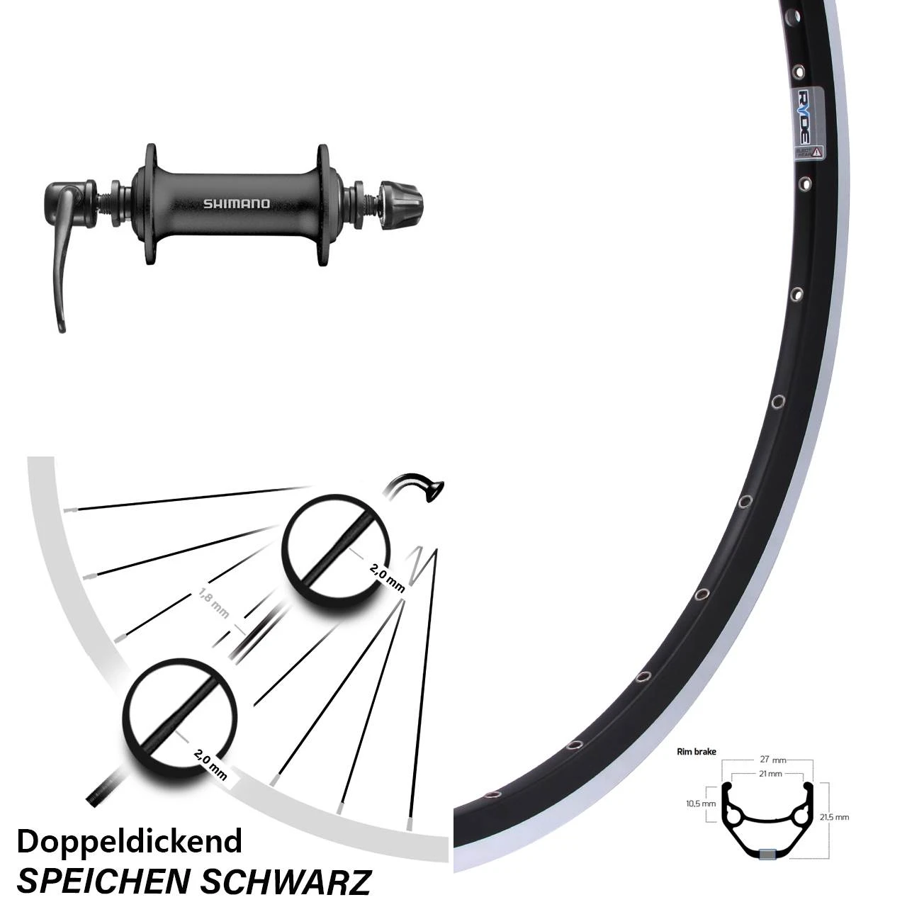 Technische Daten Vorderrad Ryde ZAC 421 Felgenbremse schwarz mit Nabe Shimano HB-T3000 AL schwarz