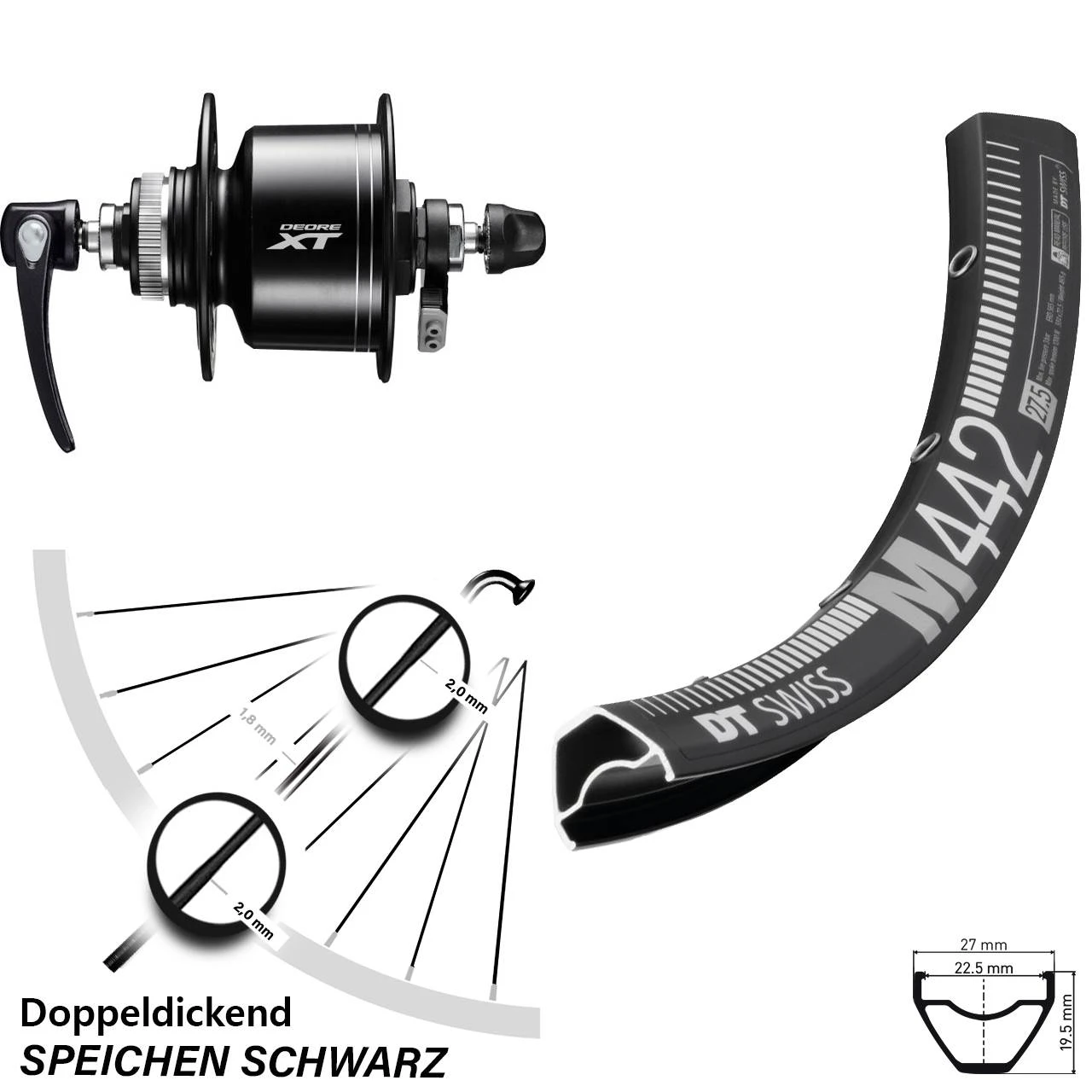 - Vorderrad 27,5 Zoll DT Swiss M 442 schwarz mit Nabendynamo Shimano Deore XT DH-T8000 schwarz