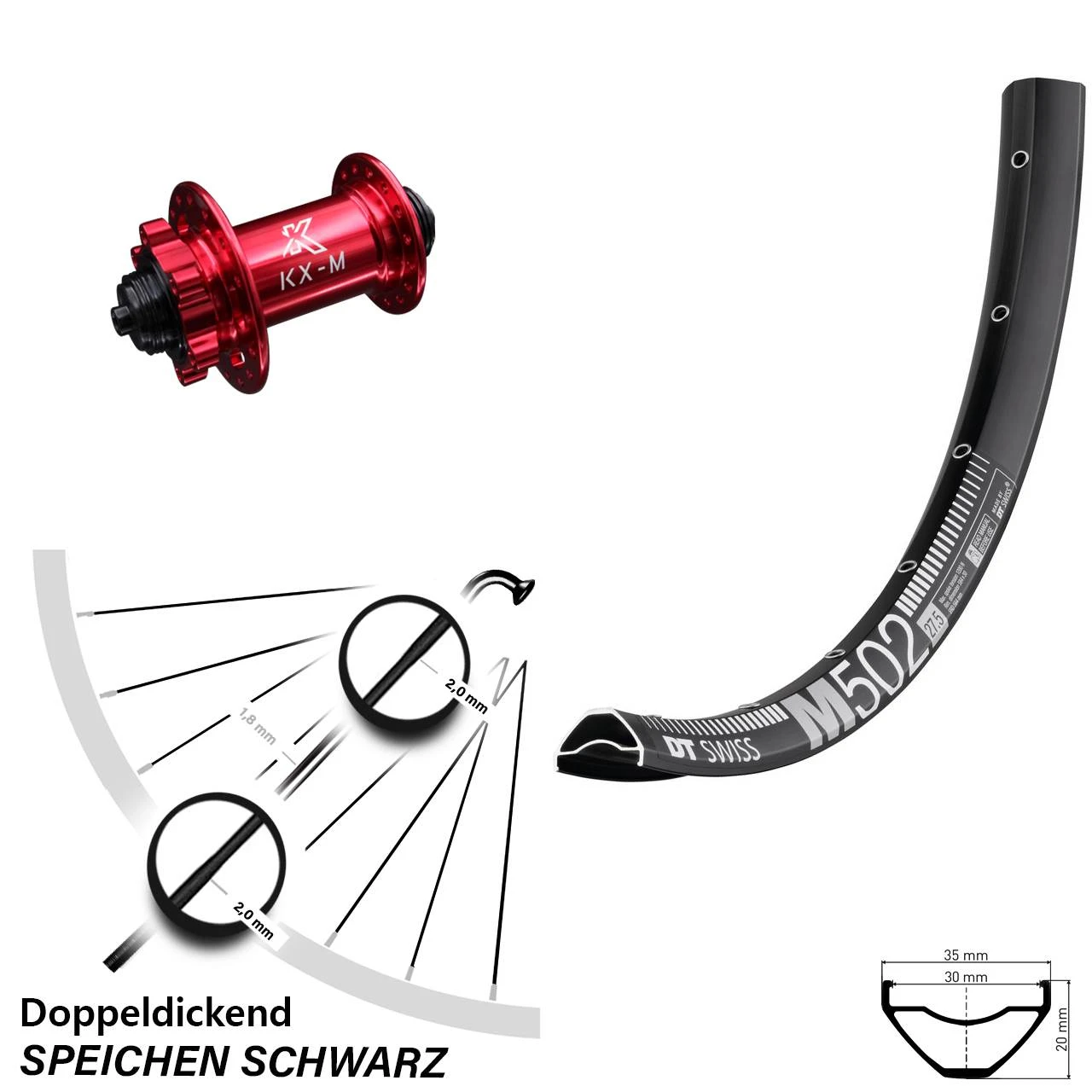 - 27,5 Zoll Vorderrad KX-M Nabe rot-eloxiert 5×100 mm DT Swiss M 502 für 6-Loch
