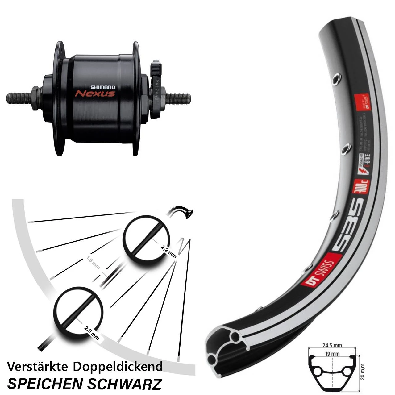 - Vorderrad 28 Zoll DT Swiss 535 schwarz mit Nabendynamo Shimano Nexus DH-C3000-3N schwarz