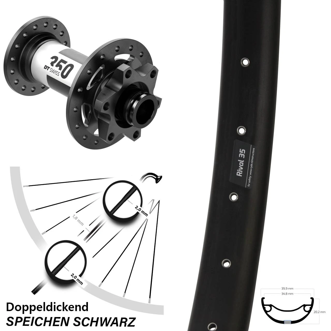 Technische Daten Vorderrad Ryde Rival 35 Disc schwarz mit Nabe DT Swiss 350 Boost 6-Loch 15/110