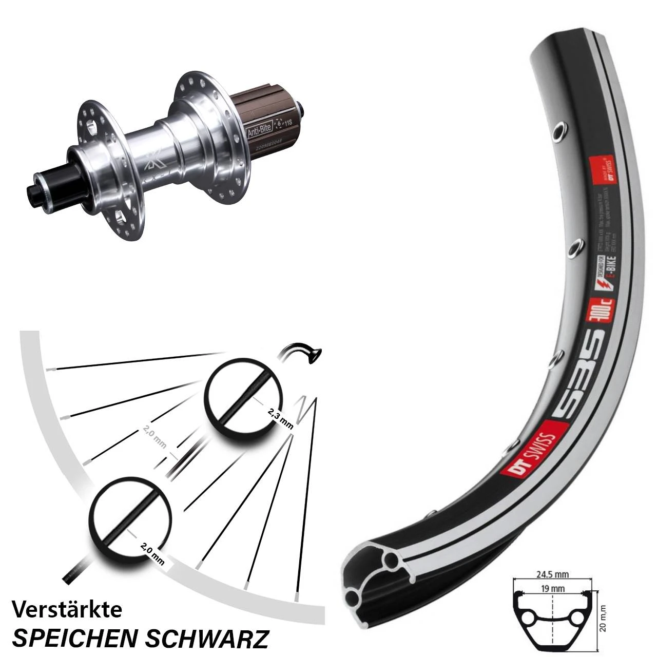 Dieses Hinterrad ist mit verstärkten Speichen, sogenannten Eindickendspeichen (auch ID oder ED genannt) bestückt. Die Speichen sind im empfindlichen und bruchgefährdeten Bogenbereich mit 2,34 mm Querschnitt besonders verstärkt ausgeführt. Die restliche Speiche weist eine Dicke von 2,0 mm auf. Dadurch kann das Laufrad insgesamt höher belastet werden, sei es durch schwere Fahrer oder mit viel Gepäck.
