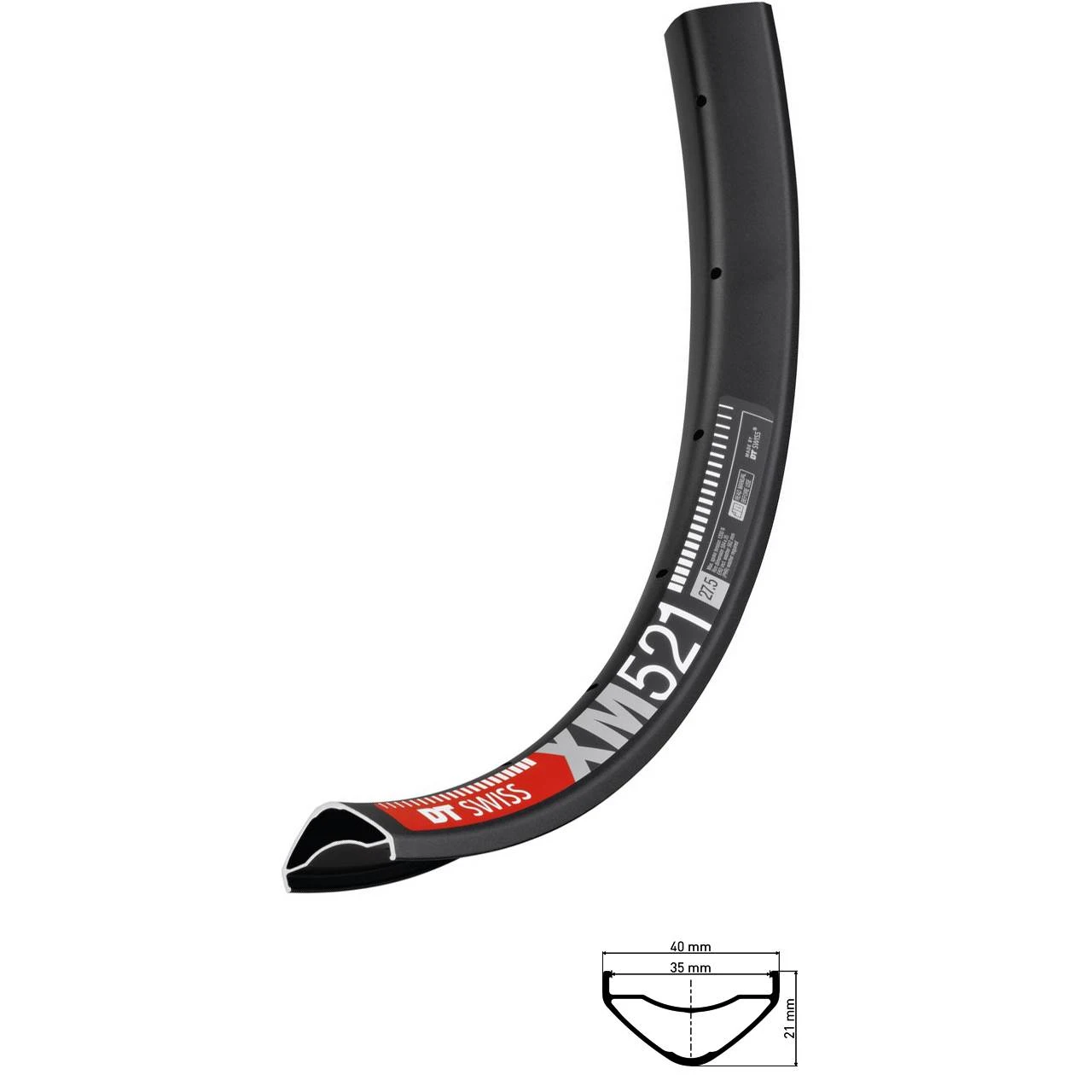 Mit der MTB-Felge XM 521 in der Farbe Schwarz hat der Markenhersteller DT Swiss aus der Schweiz eine stabile Hohlkammer-Felge aufgelegt. Sie ist sehr robust, dank des verbauten Aluminiums jedoch recht leicht. Die ungeösten Nippellöcher mit Unterlegscheibe und das verstärkte und breite Profil sorgen für hohe Stabilität, auch wenn es mal abseits befestigter Wege entlanggeht. Die schwarze DT Swiss MTB Felge XM 521 aus Aluminium ist hochwertig und sauber verarbeitet, was für eine hohe Langlebigkeit und schöne Optik sorgt. Sie können auf diese Fahrradfelge (Maulweite 35 mm, Breite 40 mm und Höhe 21 mm) problemlos auch sehr großvolumige und breite Fahrradreifen aufziehen. Ihr Verwendungszweck liegt in den Bereichen Mountainbike / MTB, Leichtbau. Die DT Swiss XM 521 Fahrradfelge ist für Scheibenbremsen bzw. Disc Brakes konzipiert. Dank der belastbaren Hohlkammer-Bauweise können Sie die Felge XM 521 mit einem Systemgewicht von recht hohen 120 kg fahren. Somit ist eine schwere Beladung des Bikes für die Fahrradfelge XM 521 in der Regel kein Problem. Da diese Felge auch für Tubeless Ready (TLR) vorgesehen ist, können Sie sie auch mit einem speziellen Tubeless-Ready-Reifen fahren und müssen keinen Schlauch einziehen.