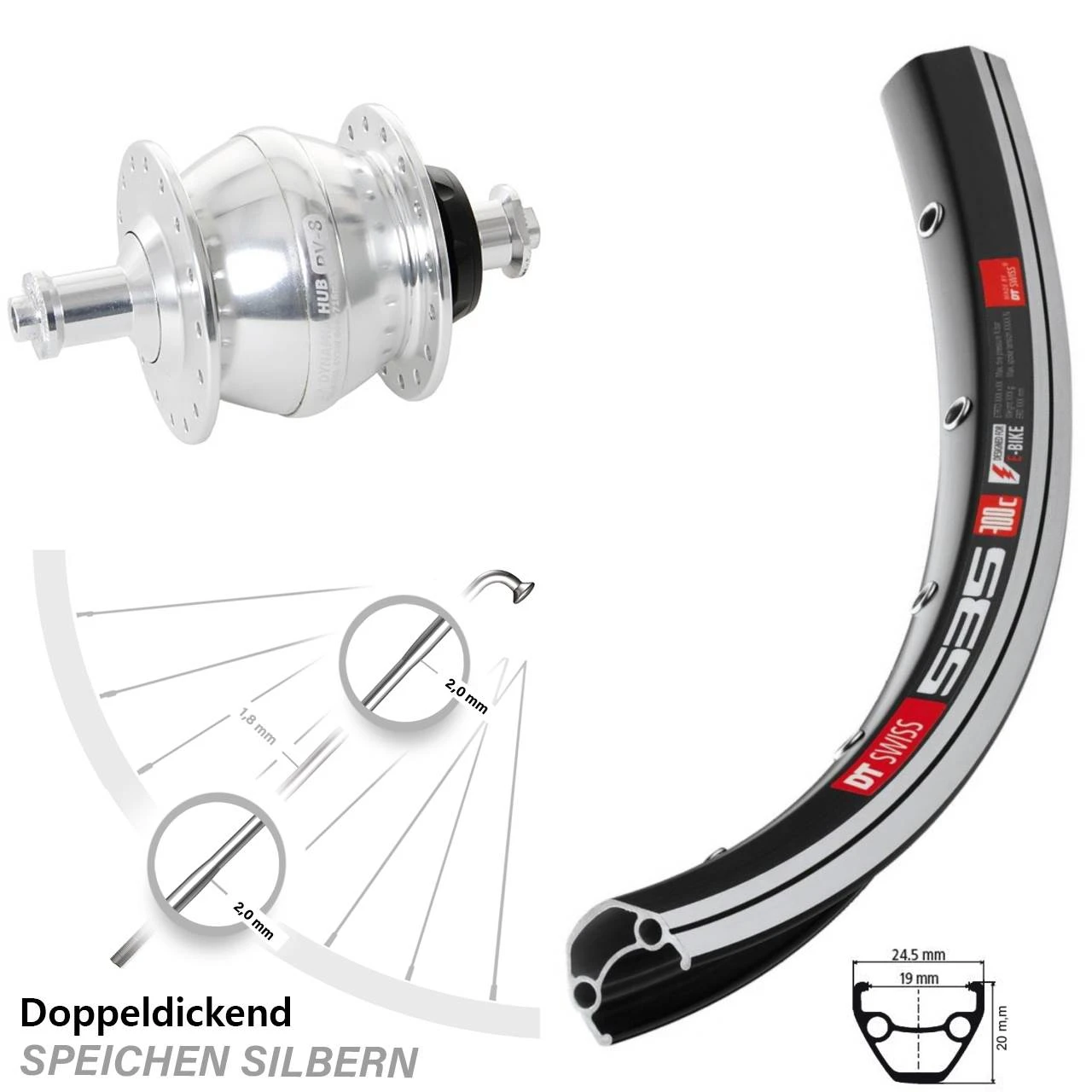 - Vorderrad 26 Zoll DT Swiss 535 schwarz mit Nabendynamo Shutter Precision PV-8 silbern