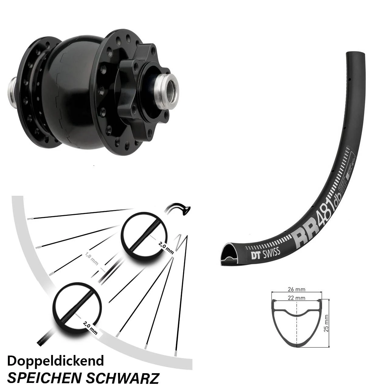 Technische Daten Vorderrad DT Swiss RR 481 DB Disc schwarz & Nabendynamo SON 28-12 Disc 6-Loch schwarz