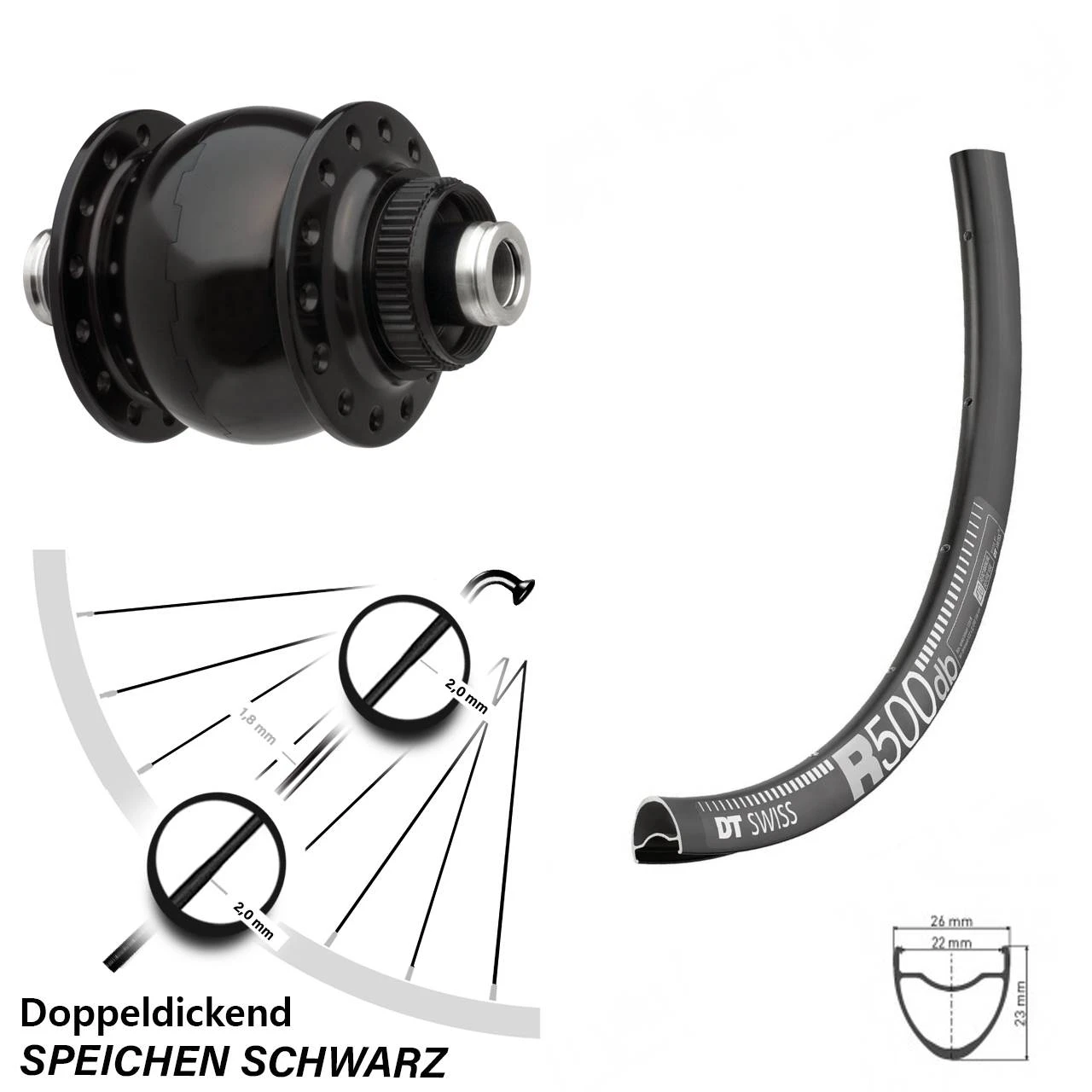 Technische Daten Vorderrad DT Swiss R 500 DB Disc schwarz & Nabendynamo SON delux Disc Centerlock Steckachse schwarz eloxiert