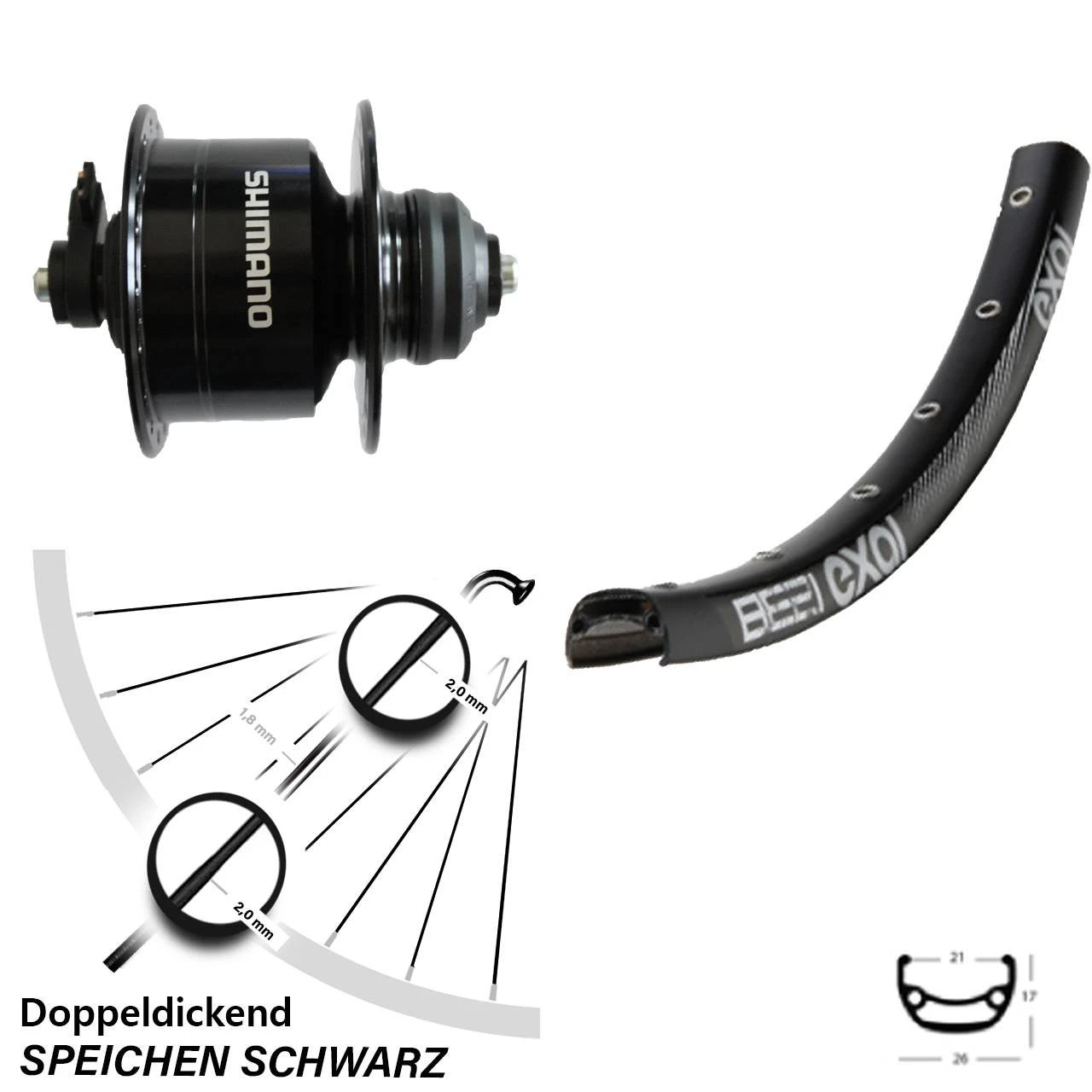 Technische Daten vorderes Laufrad Exal BE 21 schwarz & Nabendynamo Shimano DH-3D72 schwarz