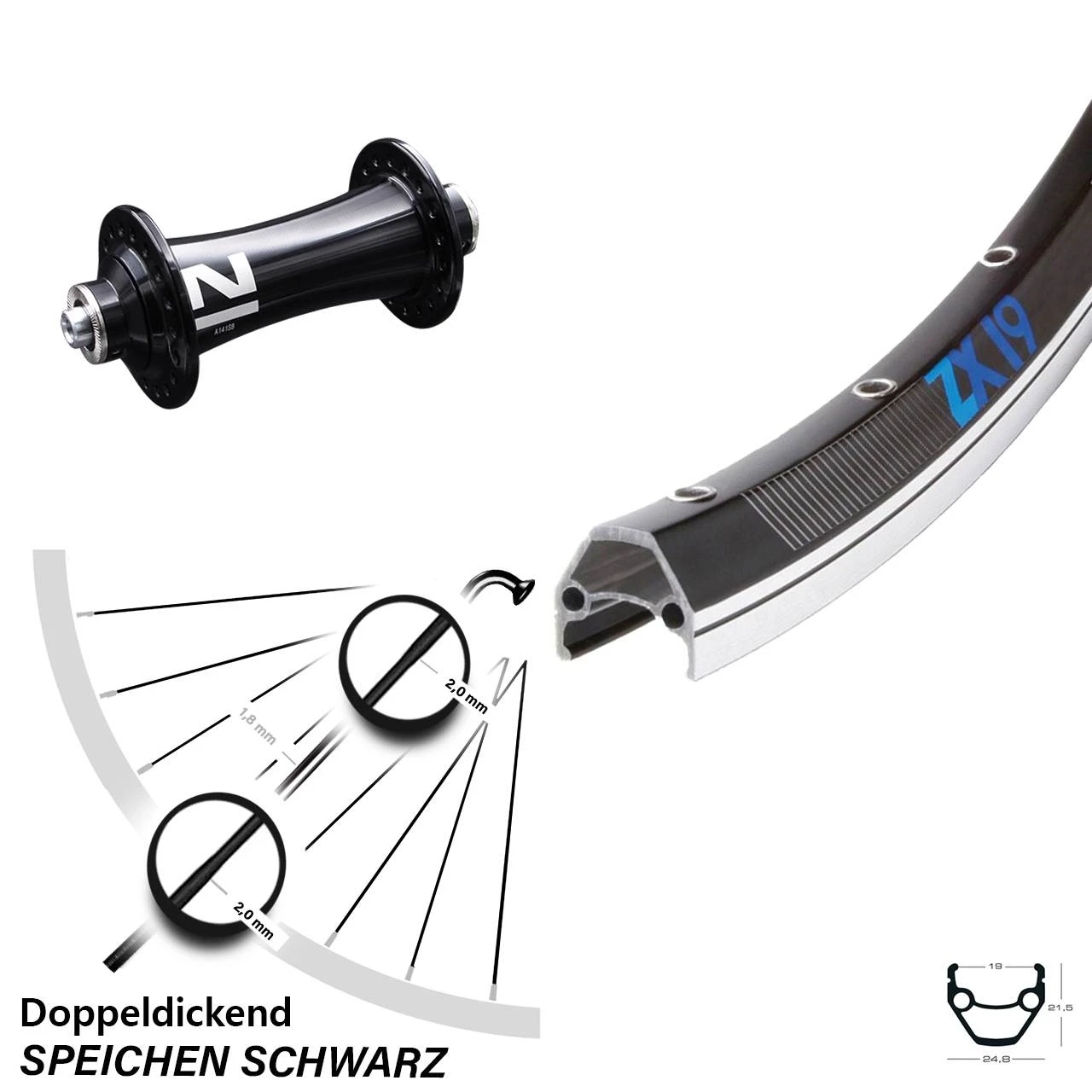 Technische Daten Vorderrad Exal ZX19 schwarz doppelt geöst mit Nabe Novatec A141SB schwarz