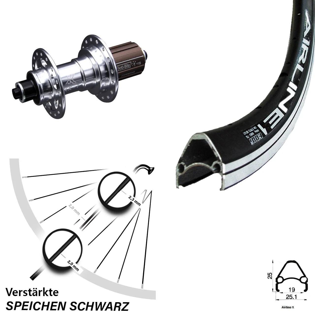 Dieses Hinterrad ist mit verstärkten Speichen, sogenannten Eindickendspeichen (auch ID oder ED genannt) bestückt. Die Speichen sind im empfindlichen und bruchgefährdeten Bogenbereich mit 2,34 mm Querschnitt besonders verstärkt ausgeführt. Die restliche Speiche weist eine Dicke von 2,0 mm auf. Dadurch kann das Laufrad insgesamt höher belastet werden, sei es durch schwere Fahrer oder mit viel Gepäck.