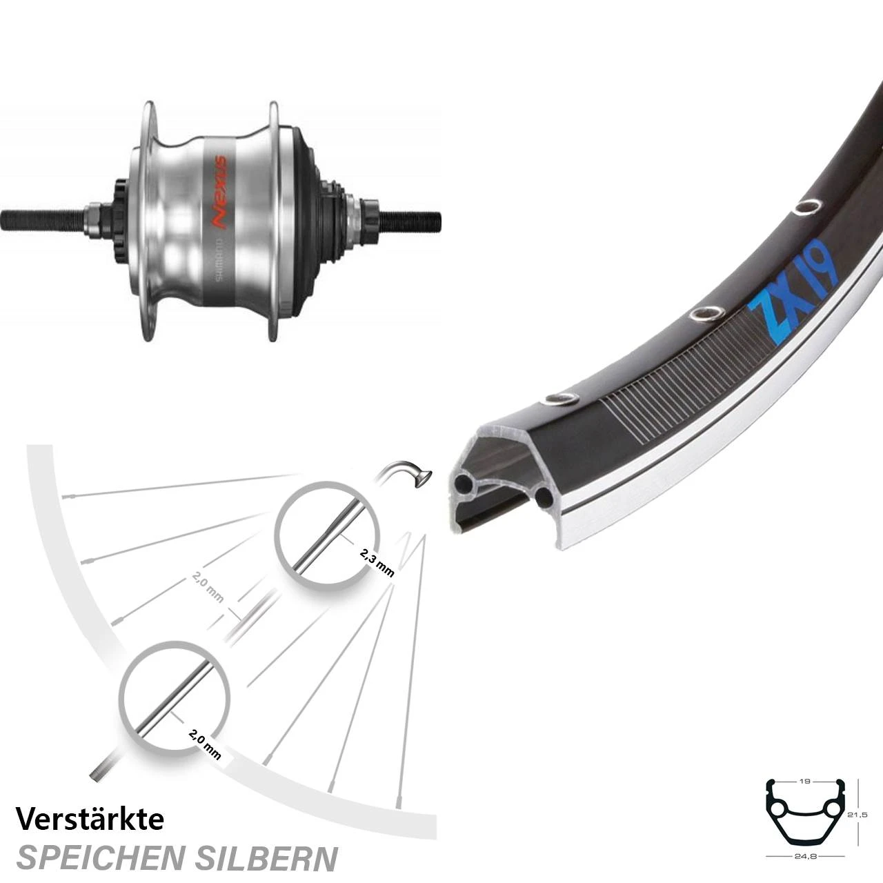 Technische Daten Hinterrad Exal ZX19 schwarz doppelt geöst und Nabe Shimano SG-7R50 silbern