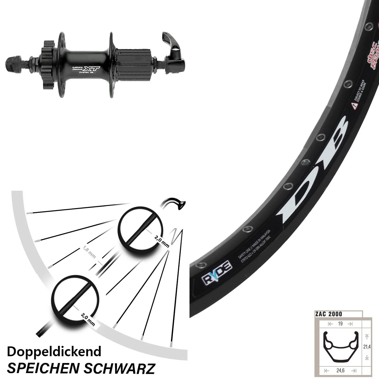 Technische Daten Hinterrad Ryde ZAC 2000 Disc schwarz und Nabe Shimano FH-M756 schwarz