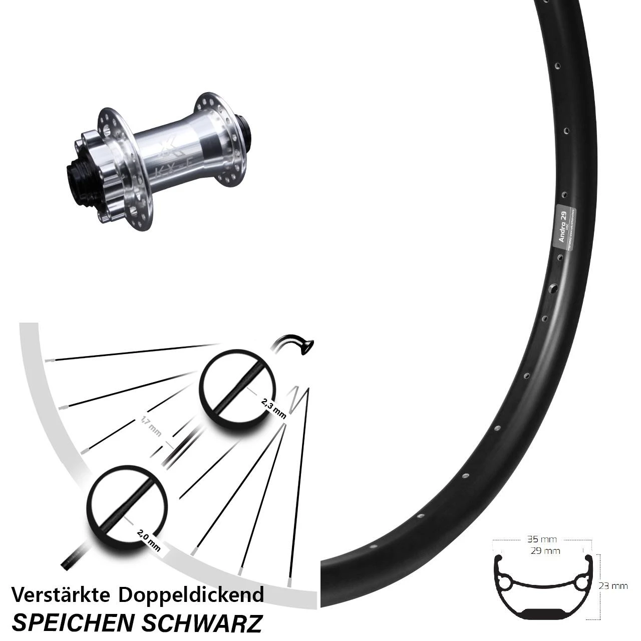 Technische Daten Vorderrad Ryde Andra 29 Disc schwarz mit Nabe KX-E Vorderradnabe 6-Loch 15/100 silbern