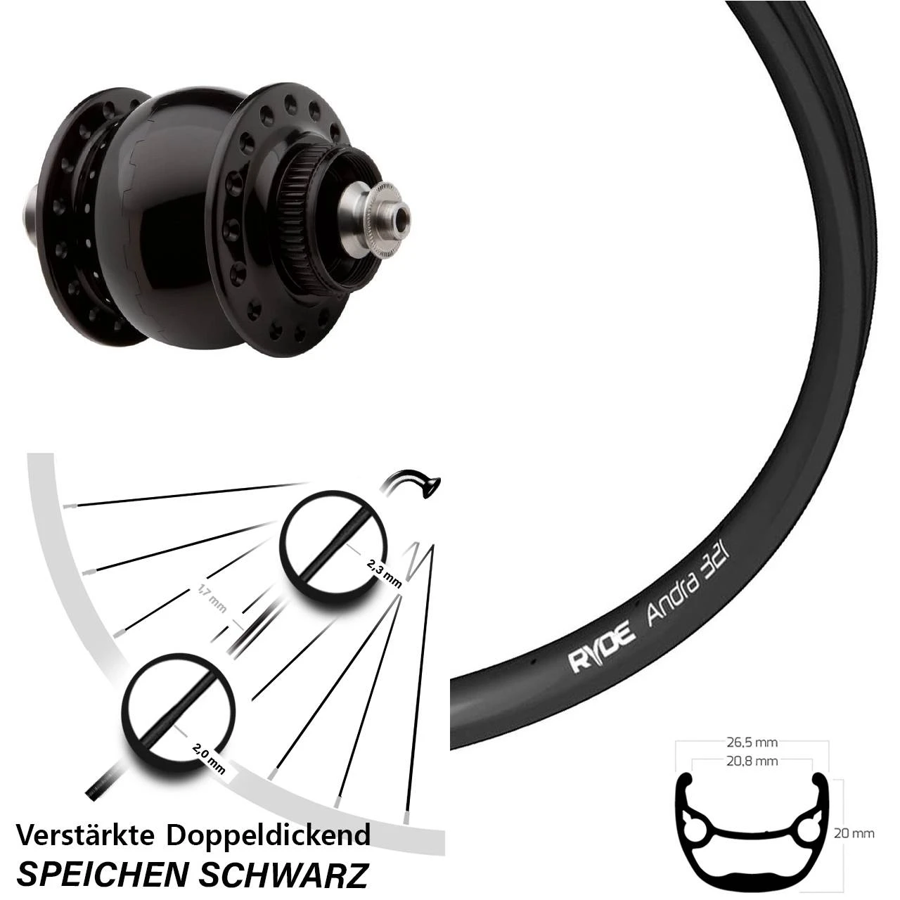 Produktbeschreibung Nabendynamo SON 28 schwarz eloxiert Ryde Andra 321 Vorderrad 27,5 Zoll