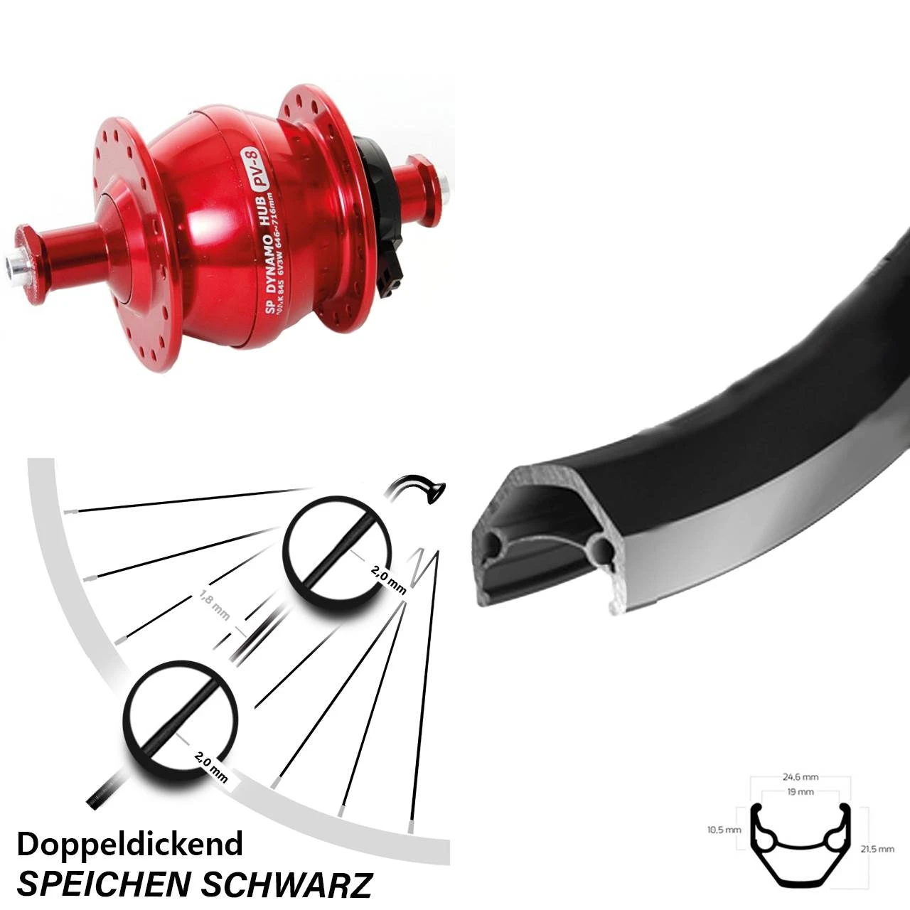 Technische Daten vorderes Laufrad Ryde ZAC 2000 Felgenbremse schwarz & Nabendynamo Shutter Precision PV-8 Felgenbremse rot
