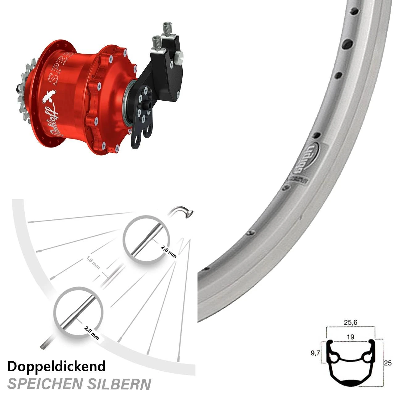 Technische Daten Hinterrad Ryde Andra 10 Felgenbremse silbern und Nabe Rohloff Speedhub 500/14 CC EX rot