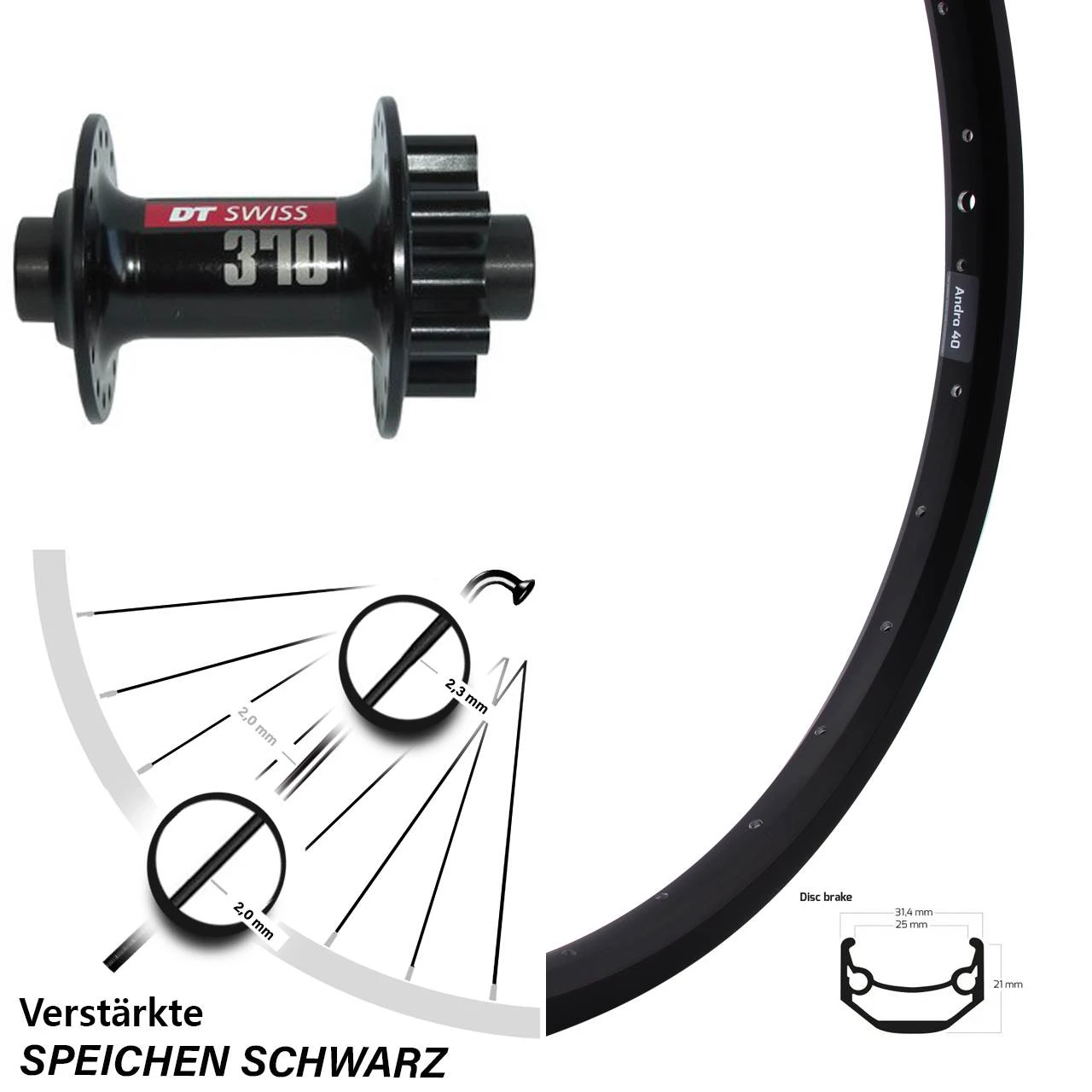 - 32 schwarze Sapim Speichen mit Speichenstärke 2,34/2,0 mm Edelstahl verstärkt – besonders stabile und verstärkte Dickendspeiche mit 2,34 mm Durchmesser im kritischen Bereich der Nabe