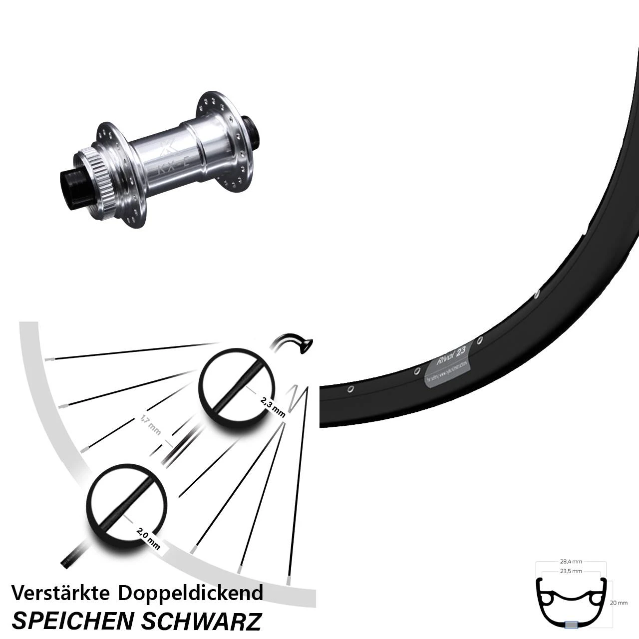 Technische Daten Vorderrad Ryde Rival 23 Disc schwarz mit Nabe KX-E Vorderradnabe Centerlock 15/100 silbern