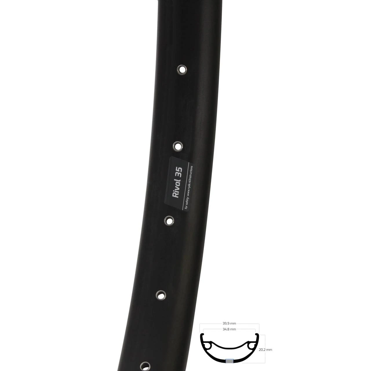Der niederländische Markenhersteller Ryde hat mit der schwarzen Fahrradfelge Rival 35 Disc mit der ETRTO 35-584 eine sehr stabile und robuste Felge aus dickwandigem und hochwertigen Aluminium mit einfach geösten Nippellöchern hergestellt. Sie ist mit 150 kg maximalem Systemgewicht sehr hoch belastbar. Somit hat Ryde einen optimalen Mittelweg für Gewicht und Stabilität gefunden. Erreicht wird dieses durch robuste und hochwertige Materialien und durch die spezielle Hohlkammer-Bauweise, die dafür sorgt, dass die Ryde Rival 35 Disc auch abseits befestigter Wege, also im Gelände und auf unebenem Waldboden die Belastungen sehr gut wegsteckt. Auf die schwarze Ryde Fahrradfelge mit den Maßen Maulweite 34,8 mm, Felgen-Höhe 20 mm, Felgen-Breite 40 mm können Sie problemlos auch großvolumige und breite 27,5 Zoll, 27,5+ Zoll Reifen (Drahtreifen, Faltreifen, Tubeless Ready) mit 60-78 mm Breite montieren. Die Felgenverbindung ist gesteckt. Verwendung findet die Rival 35 Disc am Mountainbike / MTB, Lastenrad, E-Bike bis 25 km/h, E-MTB, E-Cargo, E-SUV. Ryde hat die Rival 35 Disc Felge für Bikes mit Scheibenbremsen konzipiert und wiegt 791 Gramm. Die Ryde Rival 35 Disc Felge glänzt aber nicht nur in Punkto Stabilität und Langlebigkeit, sondern auch mit sauberer und sehr guter Verarbeitung und einer edlen und minimalistischen Optik.