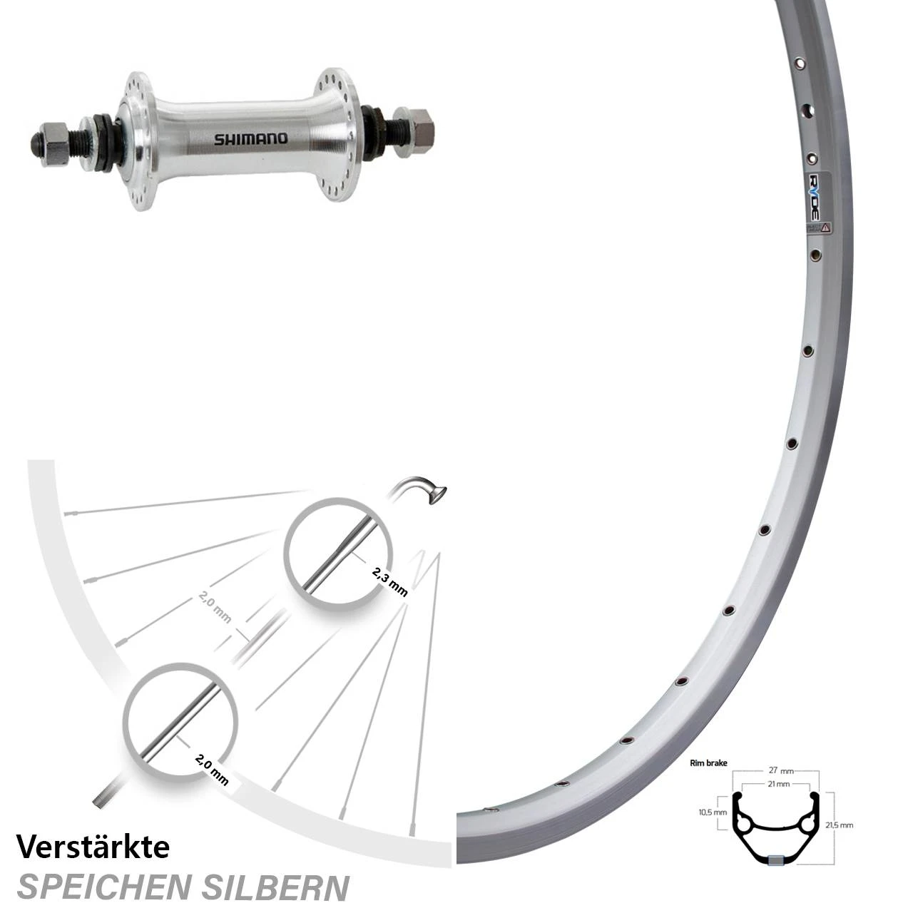 Technische Daten Vorderrad Ryde ZAC 421 Felgenbremse silbern mit Nabe Shimano HB-TX500 silbern Mutterntyp