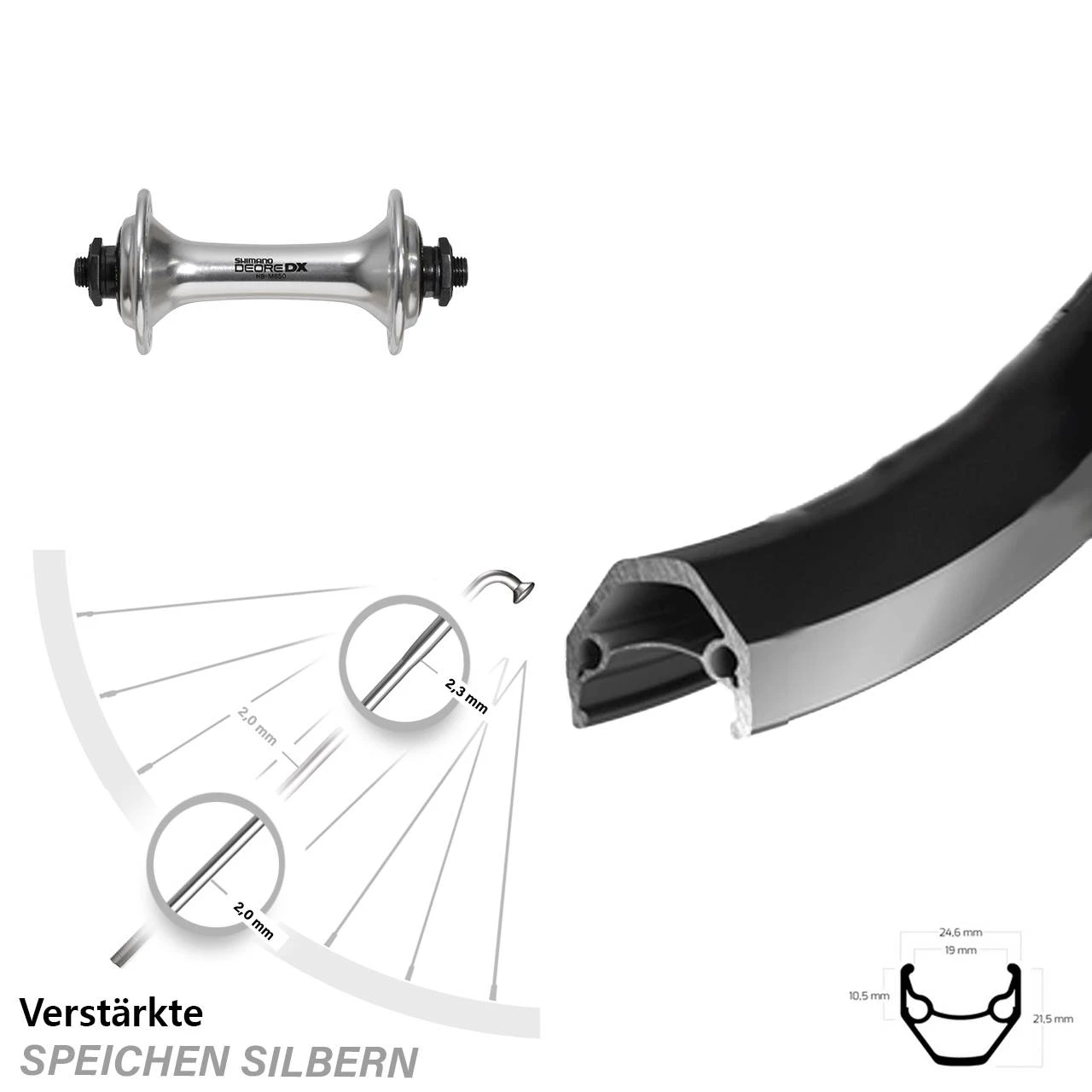 - 36 silberne Sapim Speichen mit Speichenstärke 2,34/2,0 mm Edelstahl verstärkt – besonders stabile und verstärkte Dickendspeiche mit 2,34 mm Durchmesser im kritischen Bereich der Nabe