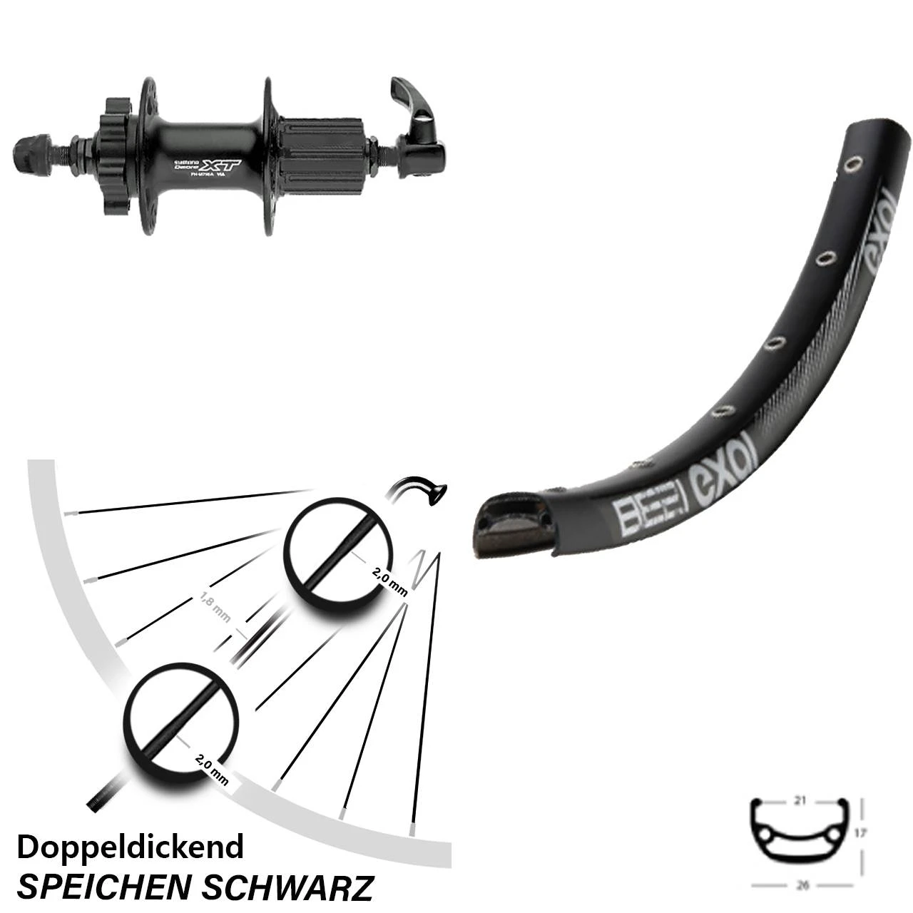 Technische Daten Hinterrad Exal BE 21 schwarz und Nabe Shimano FH-M756 schwarz