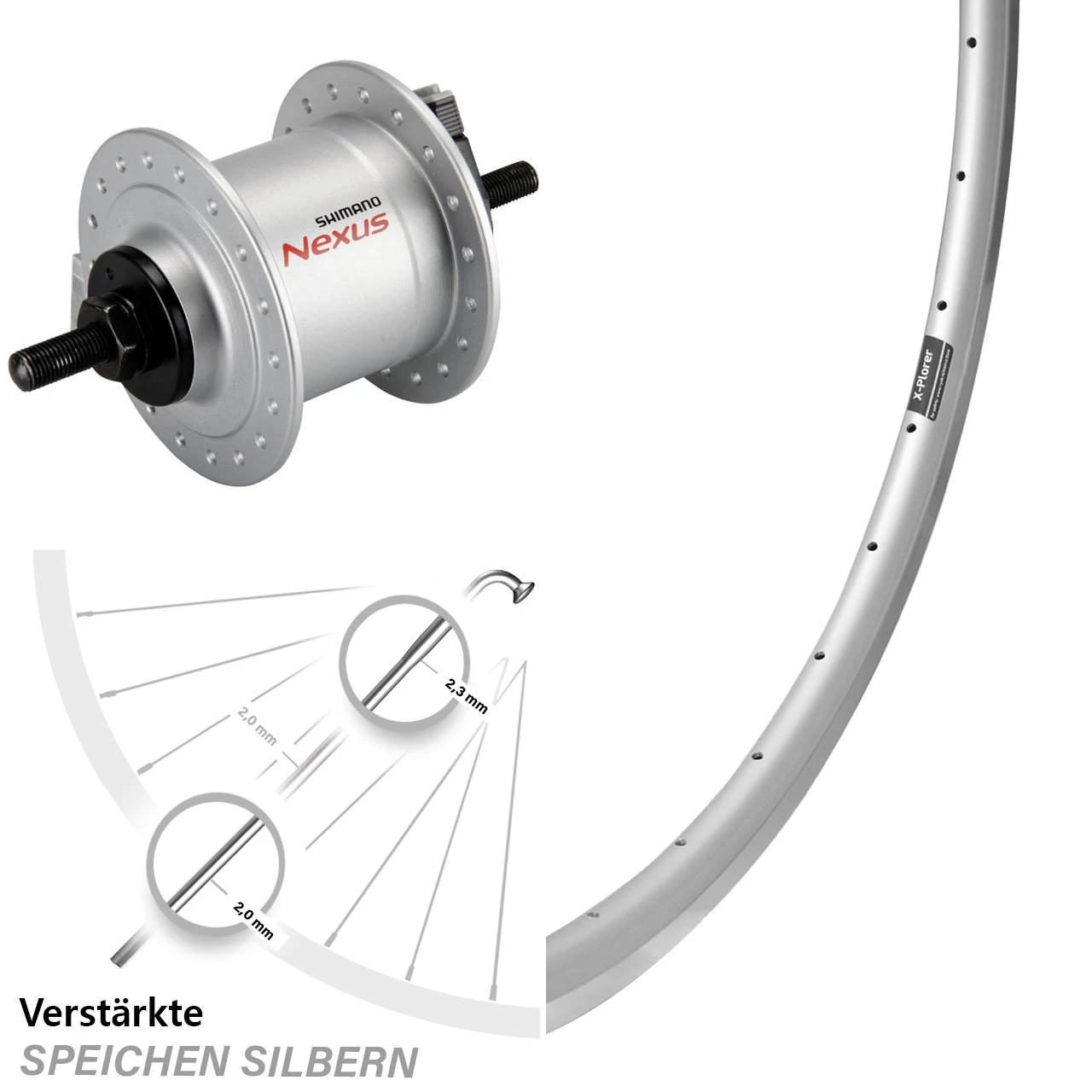 Technische Daten vorderes Laufrad Ryde X-Plorer silbern & Nabendynamo Shimano DH-C3000-1N silbern Mutterntyp