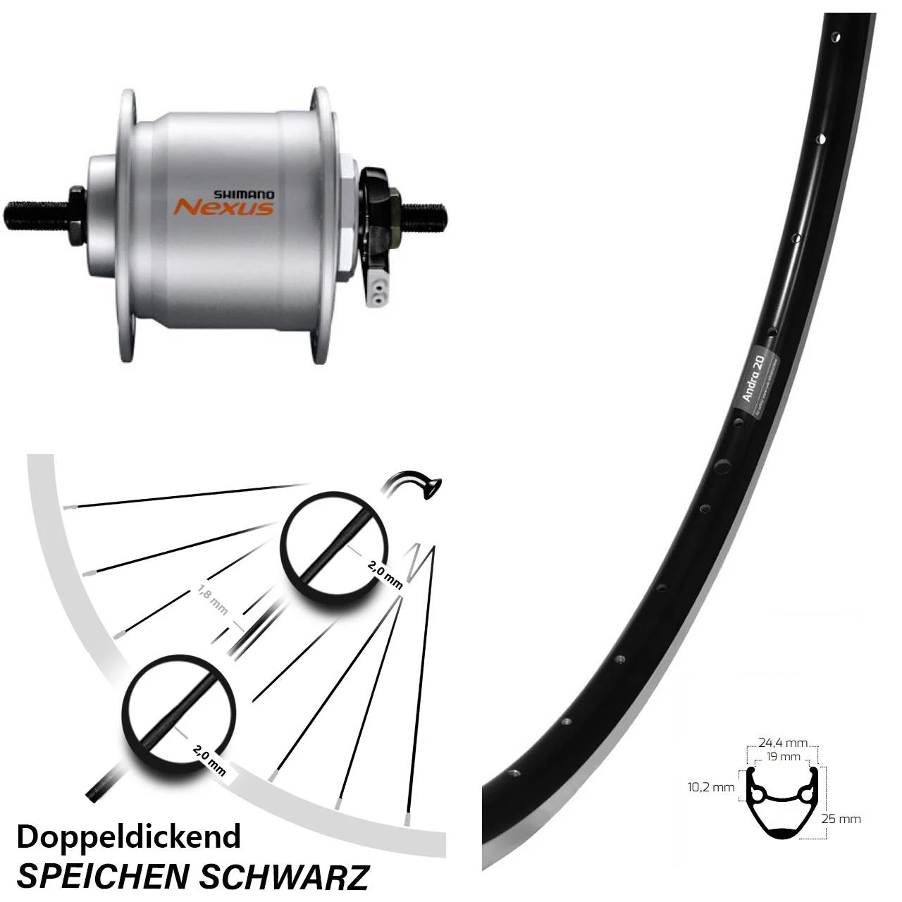 Technische Daten vorderes Laufrad Ryde Andra 20 Felgenbremse schwarz & Nabendynamo Shimano DH-C3000-3N silbern Mutterntyp