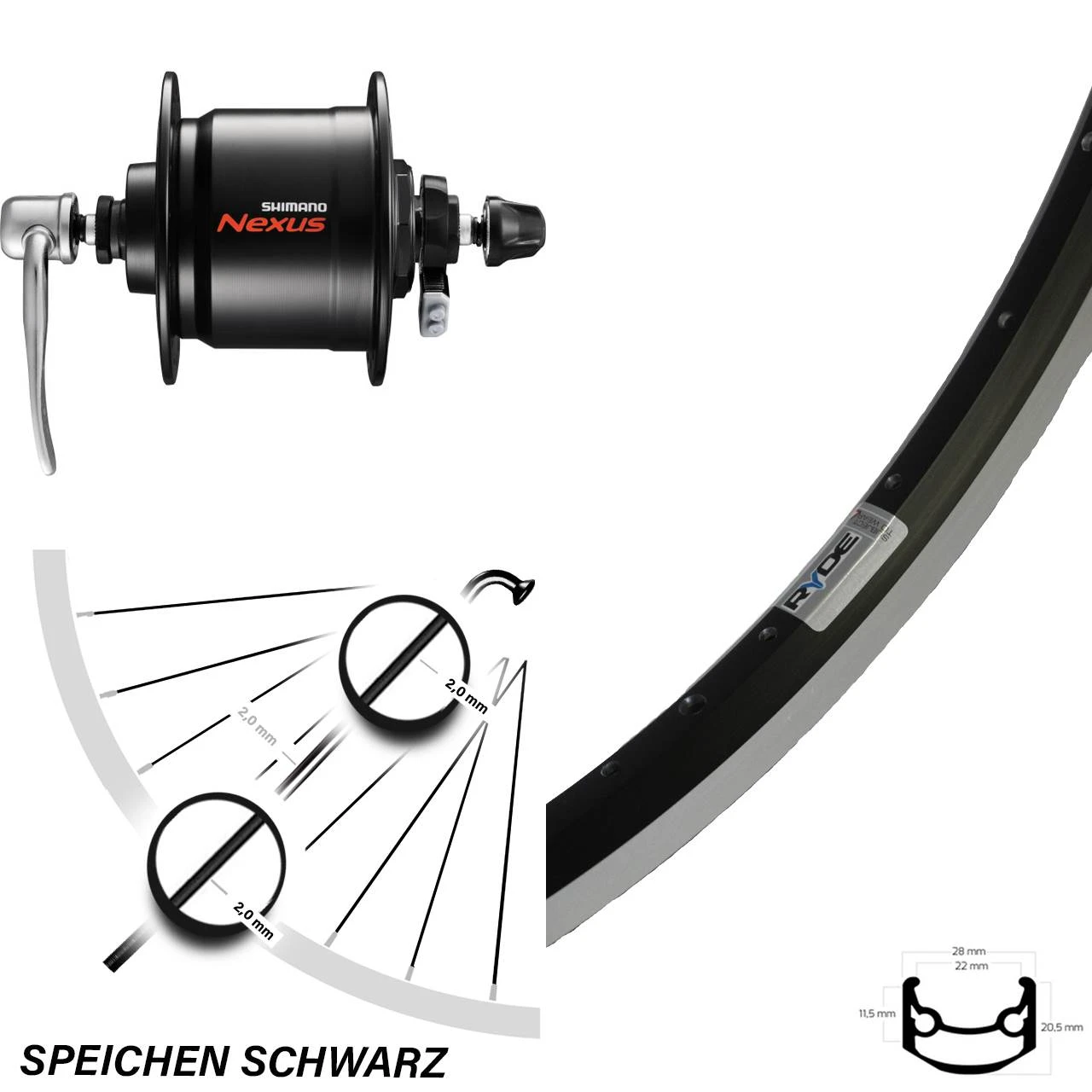 - Vorderrad 27,5 Zoll Ryde Andra 35 schwarz mit Nabendynamo Shimano Nexus DH-C3000-3N-QR schwarz