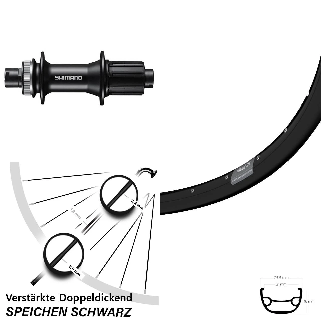 Technische Daten Hinterrad Ryde Rival 21 Disc schwarz und Nabe Shimano FH-MT400 schwarz