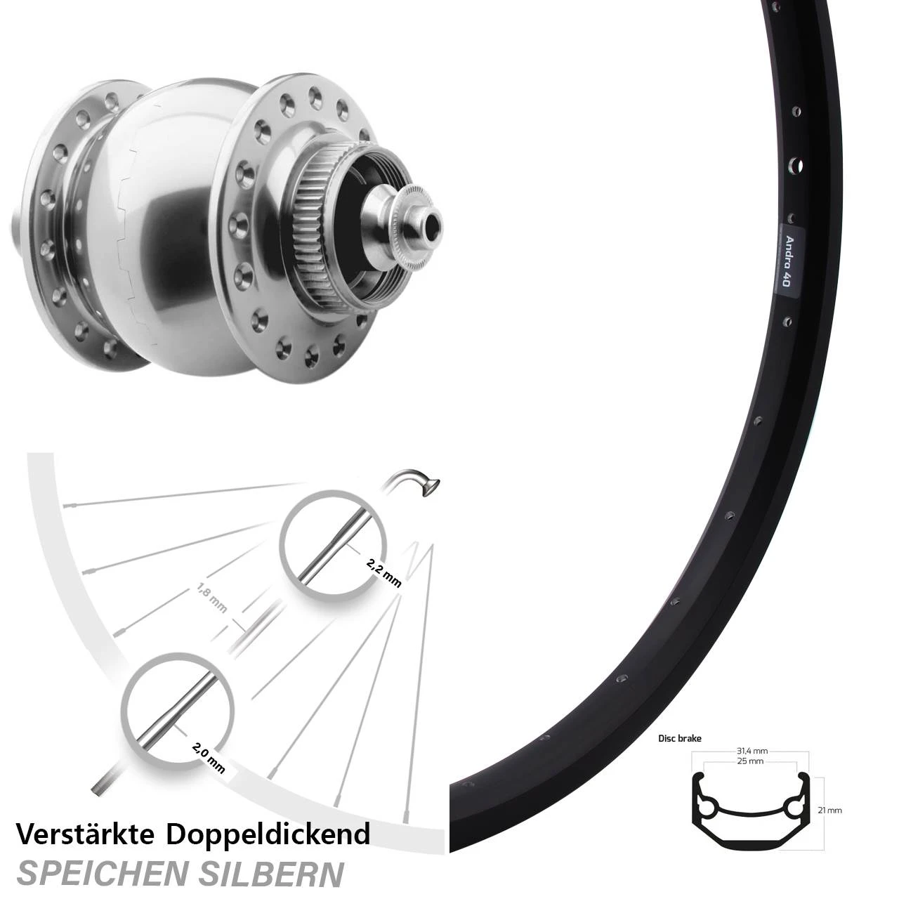 Technische Daten Vorderrad Ryde Andra 40 Disc schwarz & Nabendynamo SON 28 Disc Centerlock Hohlachse silbern eloxiert
