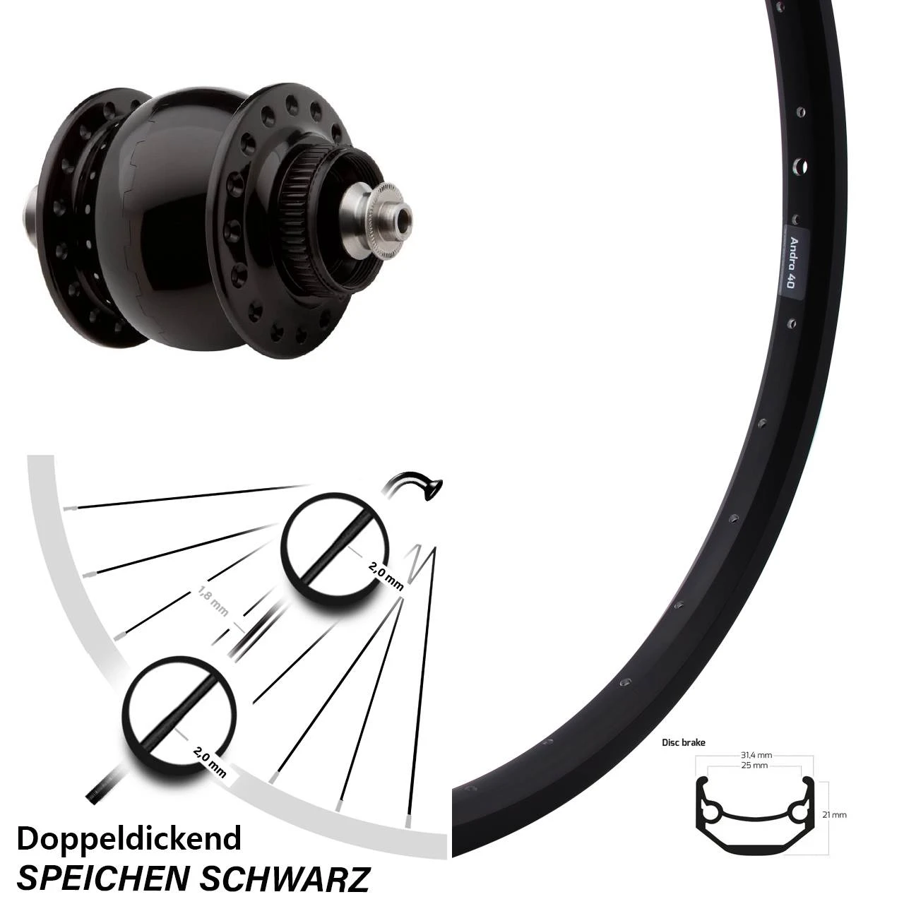 - Vorderrad 28 Zoll, 29 Zoll Ryde Andra 40 Disc schwarz mit Nabendynamo SON 28 schwarz