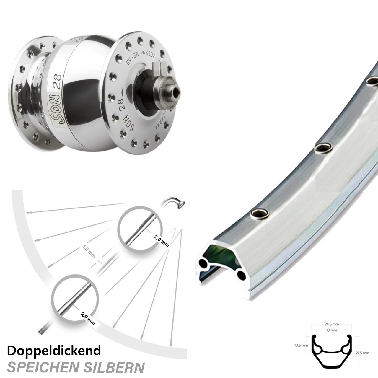 - Nabendynamo: SON 28 silbern – besonders leichtläufig